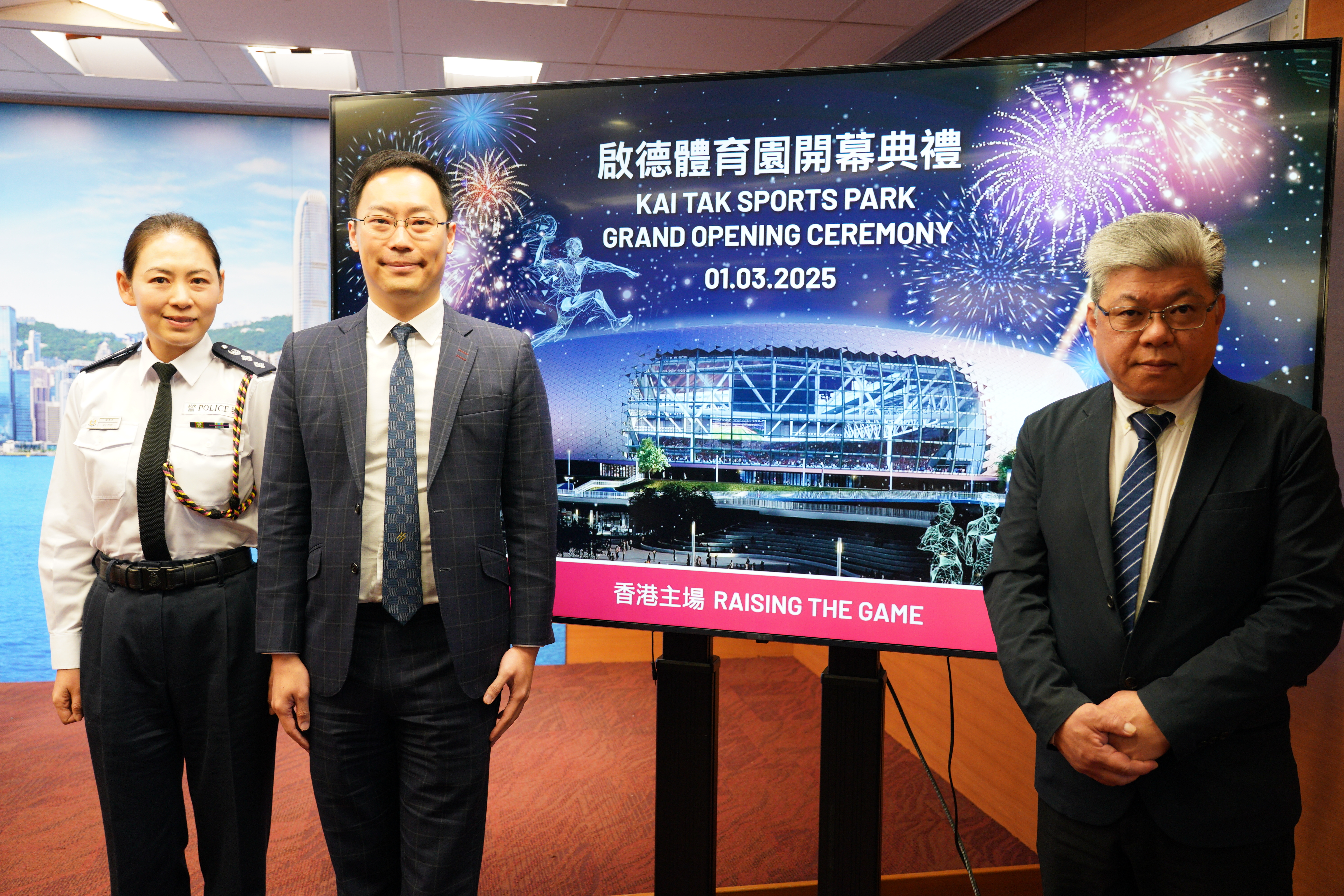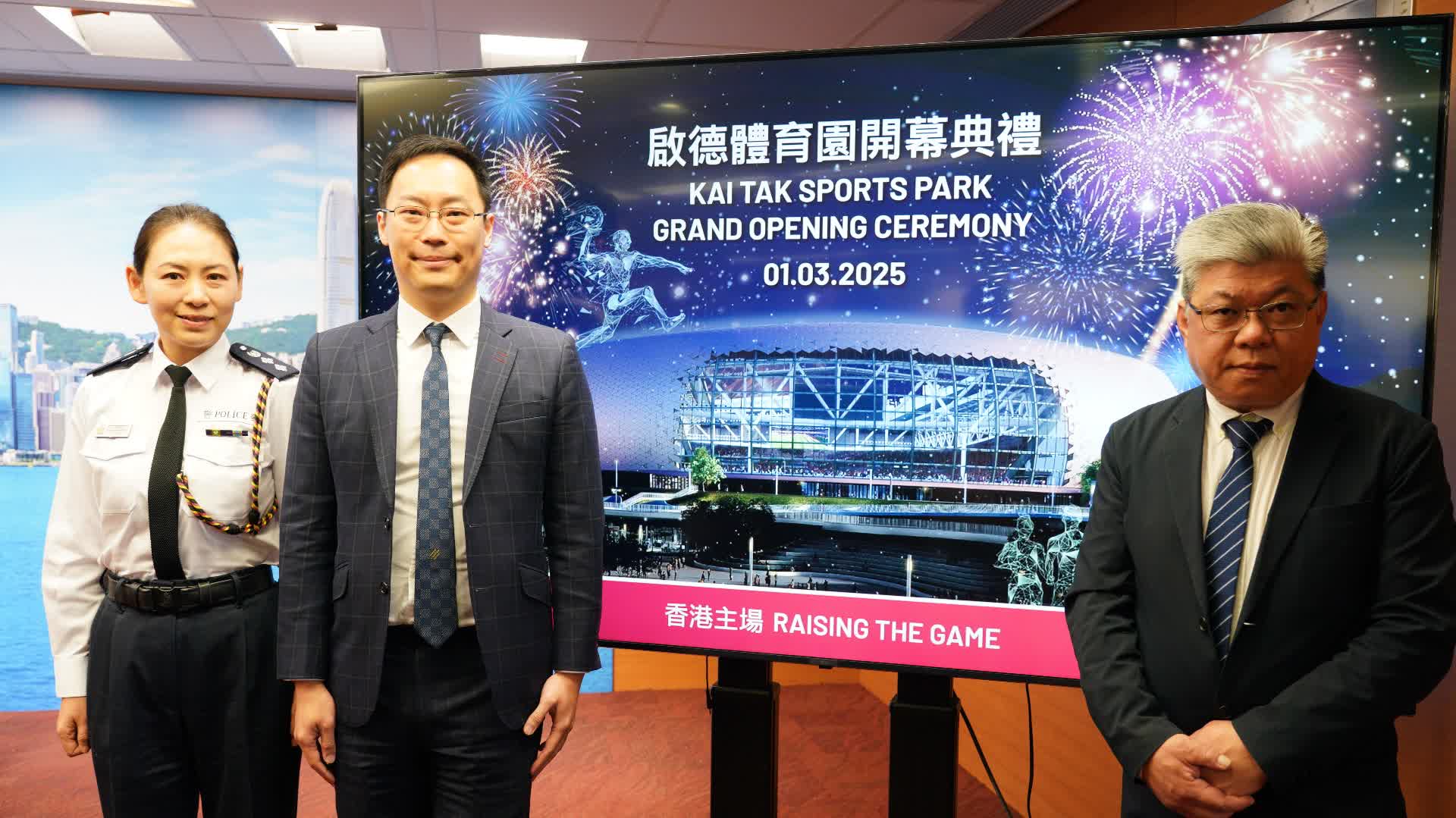 (大公文匯全媒體 記者 周傾芫)特區政府今日(28日)上午舉行跨部門傳媒簡報會,介紹有關3月1日在啟德體育園啟德主場館舉行開幕典禮的安排。體育專員蔡健斌、警務處秀茂坪區指揮官謝翠恩及運輸署首席運輸主任/市區尹柏恩等出席簡報會。
