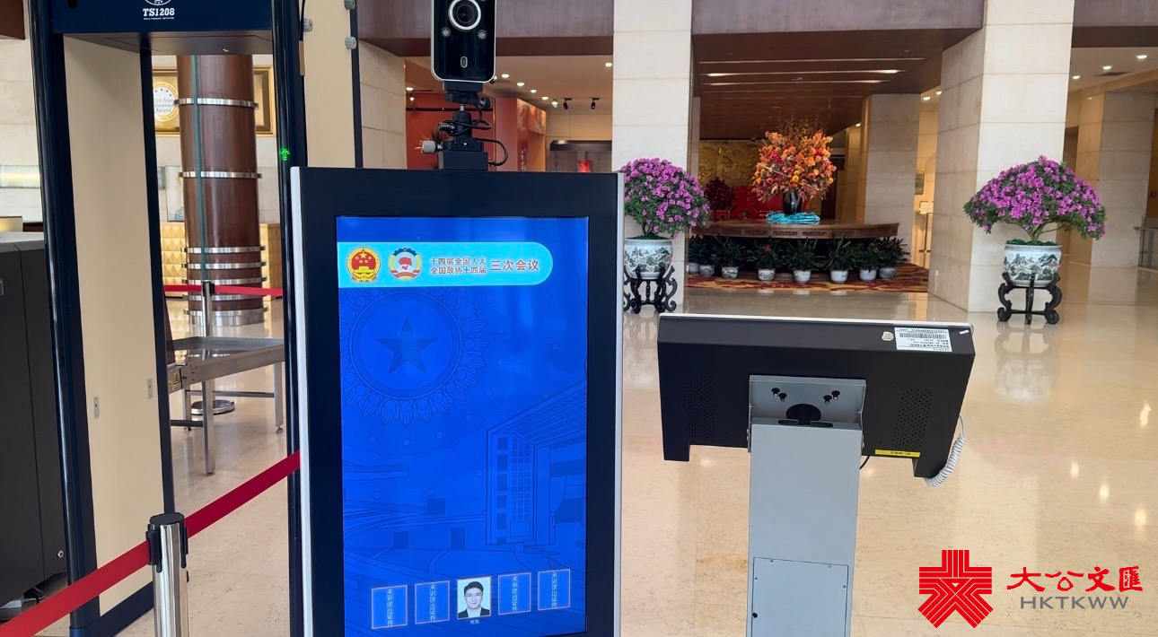 在北京飯店駐地大門口,記者看到多名清潔人員正在緊鑼密鼓的進行清掃工作,將門前的台階、入口處全部沖刷得乾乾淨淨。台階兩側擺上了生機勃勃的盆栽,迎接代表委員的到來。步入駐地大廳,兩條智能安檢通道已經調試完畢,安保人員全天候值守。經過安檢設備自動識讀卡片證件,代表委員即可通過「無感通行」快速入場。安檢屏幕上已顯示「十四屆全國人大三次會議和全國政協十四屆三次會議」的字樣。
