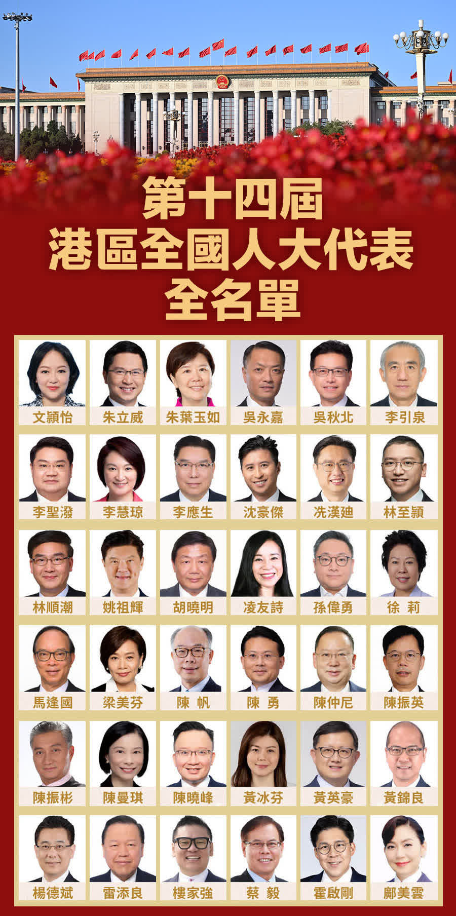 第十四屆港區全國人大代表共有36名,分別是:文頴怡、朱立威、朱葉玉如、吳永嘉、吳秋北、李引泉、李聖潑、李慧琼、李應生、沈豪傑、冼漢廸、林至頴、林順潮、姚祖輝、胡曉明、凌友詩、孫偉勇、徐莉、馬逢國、梁美芬、陳帆、陳勇、陳仲尼、陳振英、陳振彬、陳曼琪、陳曉峰、黃冰芬、黃英豪、黃錦良、楊德斌、雷添良、樓家強、蔡毅、霍啟剛、鄺美雲。當中,李慧琼亦是第十四屆全國人大常委會委員。