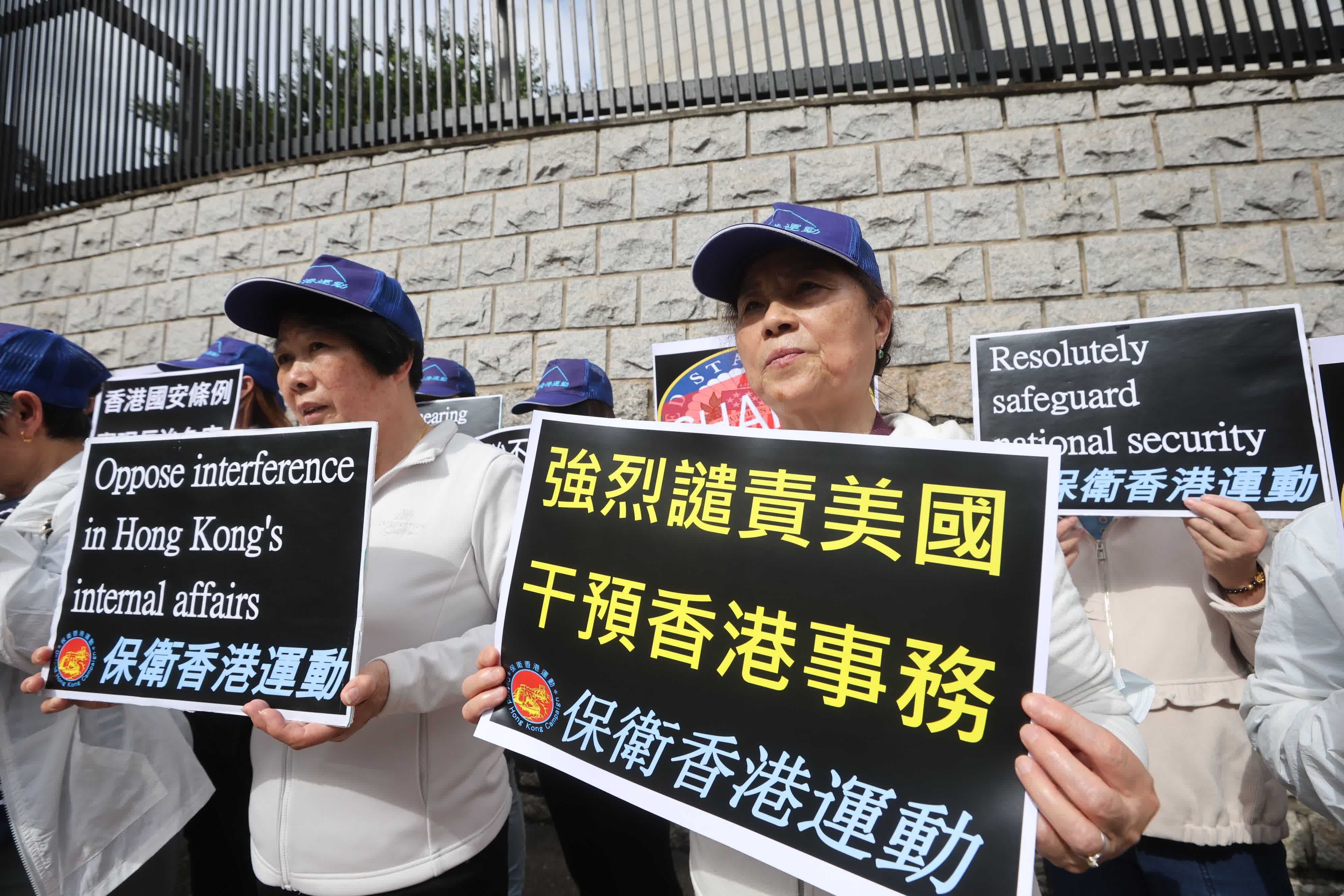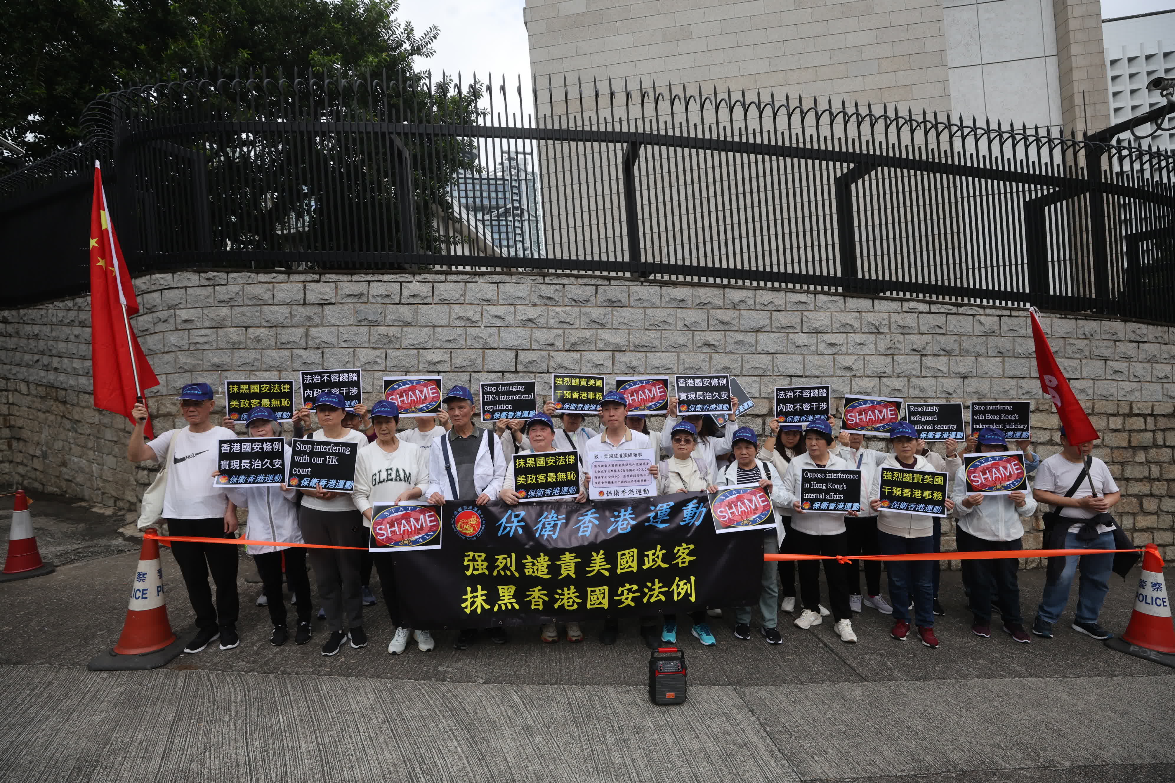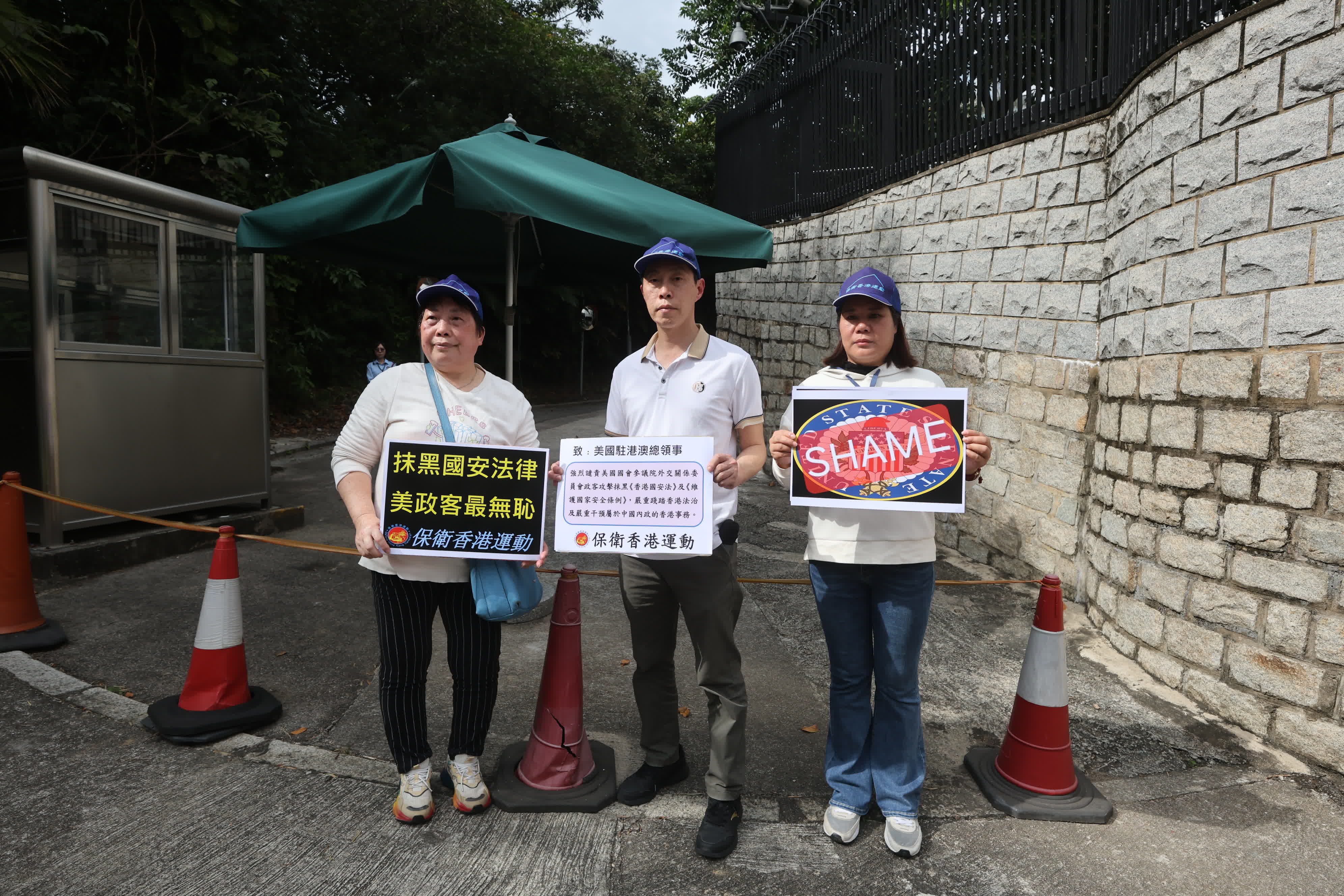 香港文匯報記者在現場留意到,參與抗議活動的成員均戴上了統一印有「保衛香港運動」藍色鴨舌帽,「保衛香港運動」主席傅振中帶領成員們共同喊出抗議口號:「強烈譴責美國,干預香港事務!抹黑國安法律,美政客最無恥!法治不容踐踏,內政不容干涉!香港國安條例,實現長治久安!」