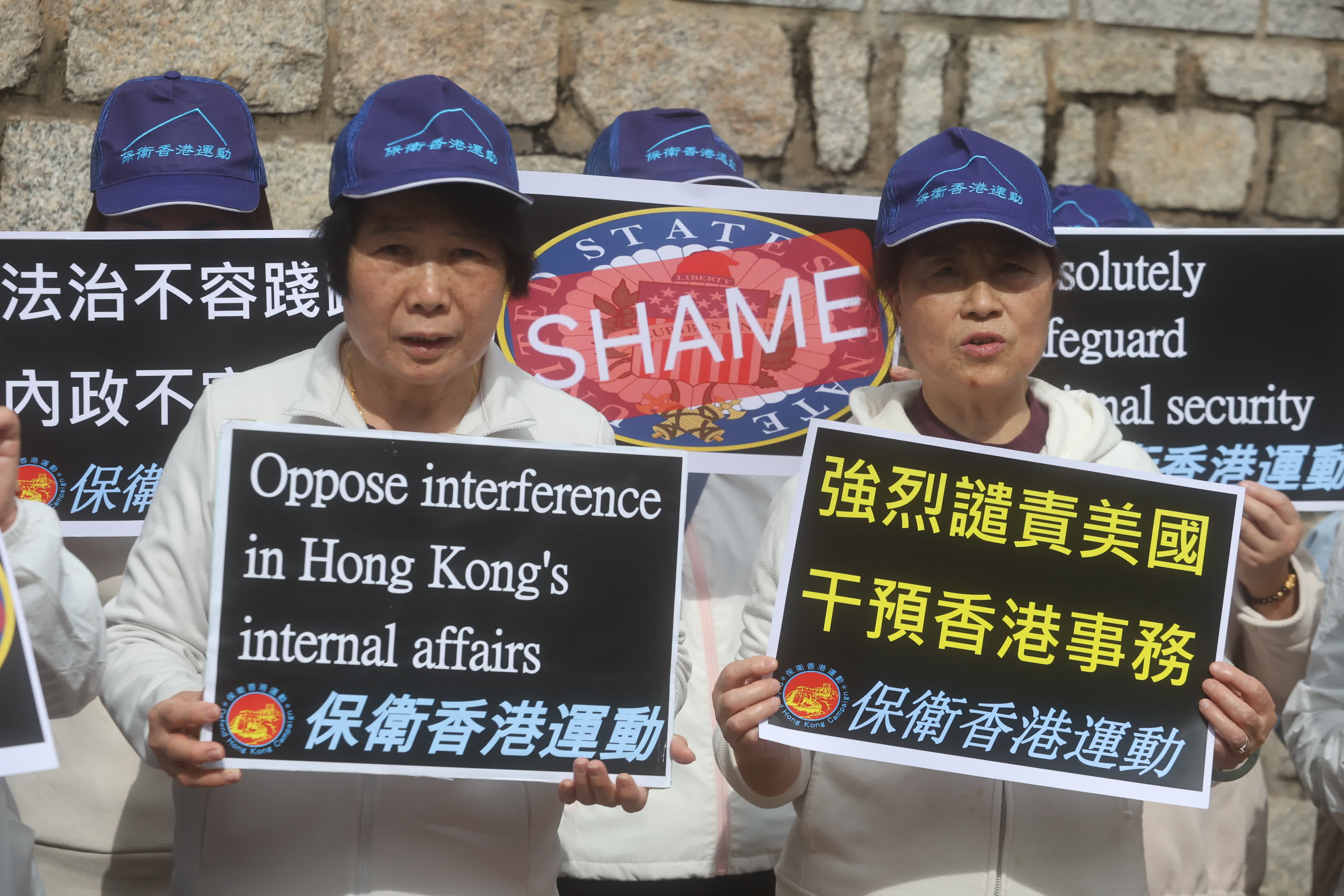 (香港文匯報 記者 蔡學怡)「保衛香港運動」於今日(2月28日)下午在美國駐港澳總領事館舉辦「强烈譴責美國政客抹黑香港國安法例」集會,強烈譴責美國國會參議院外交關係委員會個別議員攻擊抹黑香港國安法及《維護國家安全條例》,嚴重踐踏香港法治及嚴重干預屬於中國內政的香港事務。