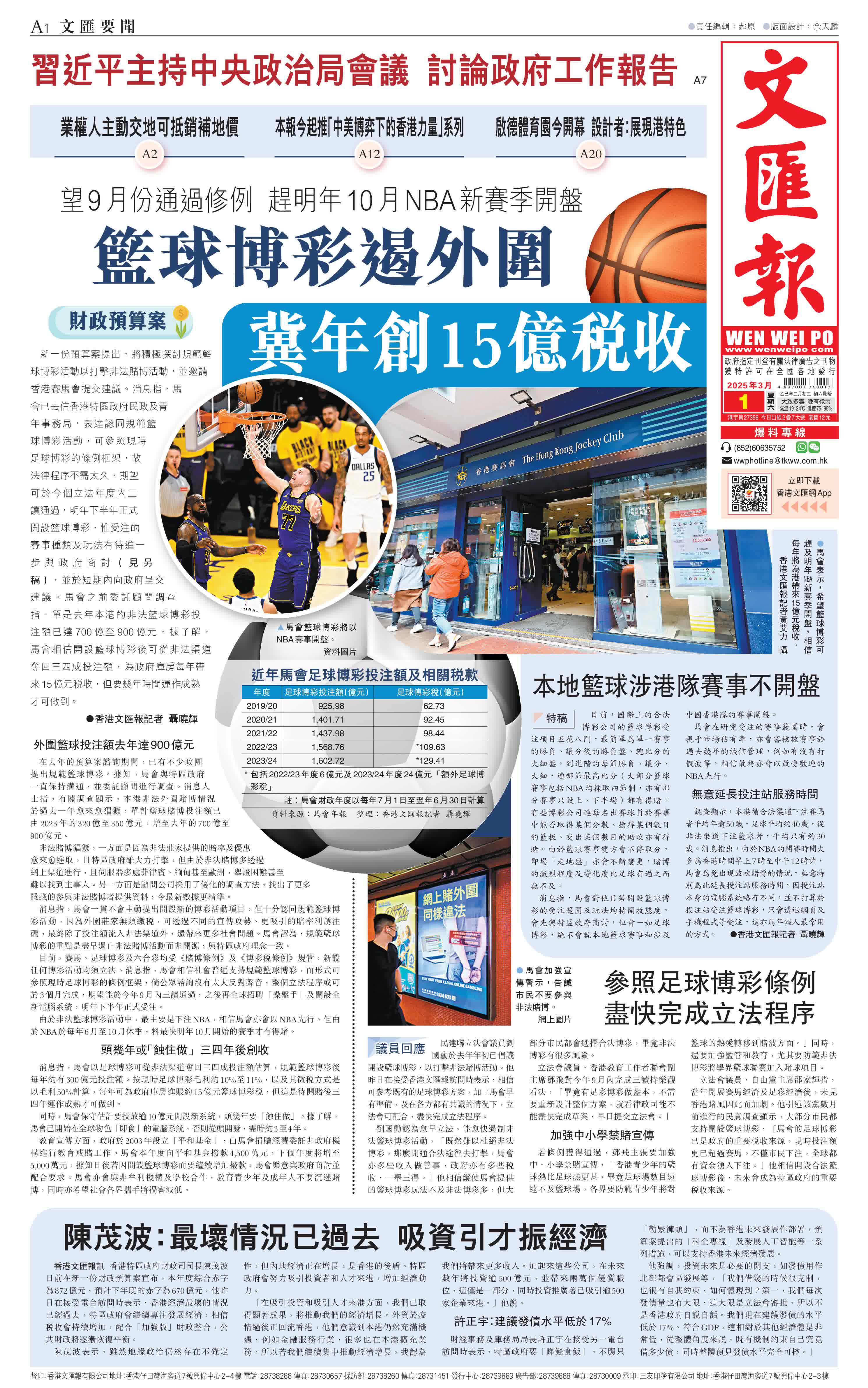 (香港文匯報記者 聶曉輝)新一份預算案提出,將積極探討規範籃球博彩活動以打擊非法賭博活動,並邀請香港賽馬會提交建議。消息指,馬會已去信香港特區政府民政及青年事務局,表達認同規範籃球博彩活動,可參照現時足球博彩的條例框架,故法律程序不需太久,期望可於今個立法年度內三讀通過,明年下半年正式開設籃球博彩,惟受注的賽事種類及玩法有待進一步與政府商討(見另稿),並於短期內向政府呈交建議。馬會之前委託顧問調查指,單是去年本港的非法籃球博彩投注額已達700億至900億元,據了解,馬會相信開設籃球博彩後可從非法渠道奪回三四成投注額,為政府庫房每年帶來15億元稅收,但要幾年時間運作成熟才可做到。