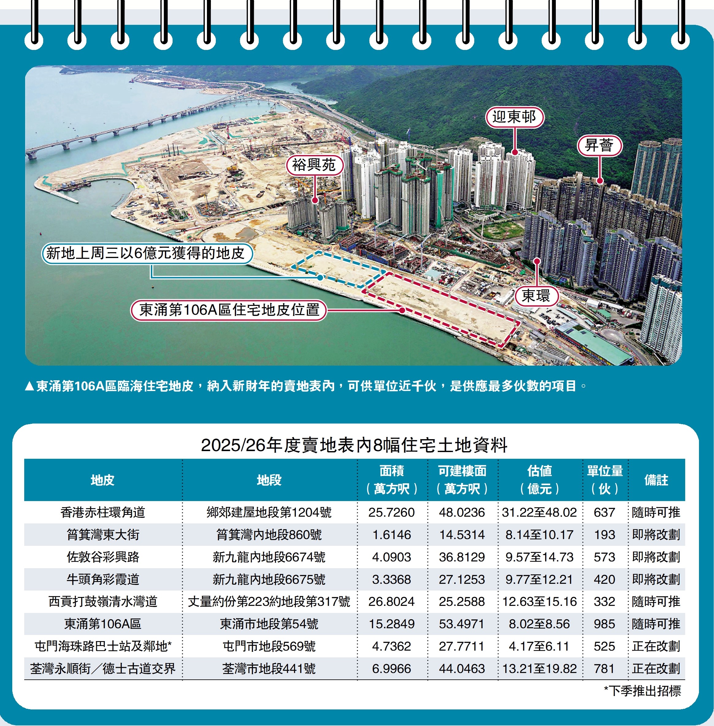 發展局昨日公布下財年的賣地計劃,8幅住宅地中,有5幅是新增,3幅是滾存自本年度內。全數地皮的預計可建單位量均少於1000個,個別是只得不足200個。發展局局長甯漢豪表示,5幅新增土地,都是於發展成熟的地區之內,且是在檢討其原有規劃用途後,認為不再需要又具有發展住宅潛力。正當市場現已逐漸回穩時,推出此類已發展區內的土地,相信對市場會有相當的吸引力。8幅土地只料提供約4450個單位,然若計及其他土地來源,即鐵路物業發展、市建局及私人市場,估計來年度的總潛在供應可建約1.37萬個單位,與年度供應目標1.32萬個相若。至於賣地表內提供單位最多的東涌106A區土地,料近千伙,而原擬要求發展商同時協助興建青年宿舍的條件,經檢討後,決定取消,青年宿舍會轉移至115區土地,以建更大型青衣宿舍。