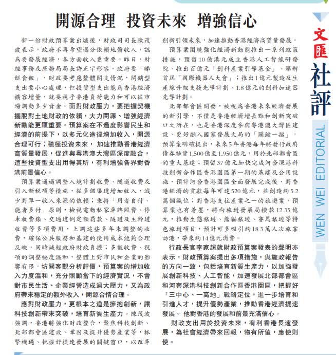 新一份財政預算案出爐後,財政司司長陳茂波表示,政府不再希望過分依賴地價收入,認為要發展經濟,各方面收入更重要。昨日,財經事務及庫務局局長許正宇形容,政府要「睇食飯」,財政要考慮整體開支情況,開銷型支出要小心處理,但投資型支出能為香港經濟擴容增量,就要視乎香港負荷能力和可以從市場調動多少資金。面對財政壓力,要把握契機擺脫對土地財政的依賴,大力開源、增強經濟新動能更顯重要。預算案在不過度影響民生和經濟的前提下,以多元化途徑增加收入,開源合理可行;積極投資未來, 加速推動香港經濟高質量發展,促進與粵港澳大灣區深度融合,這些投資型支出用得其所,有利增強各界對香港前景信心。