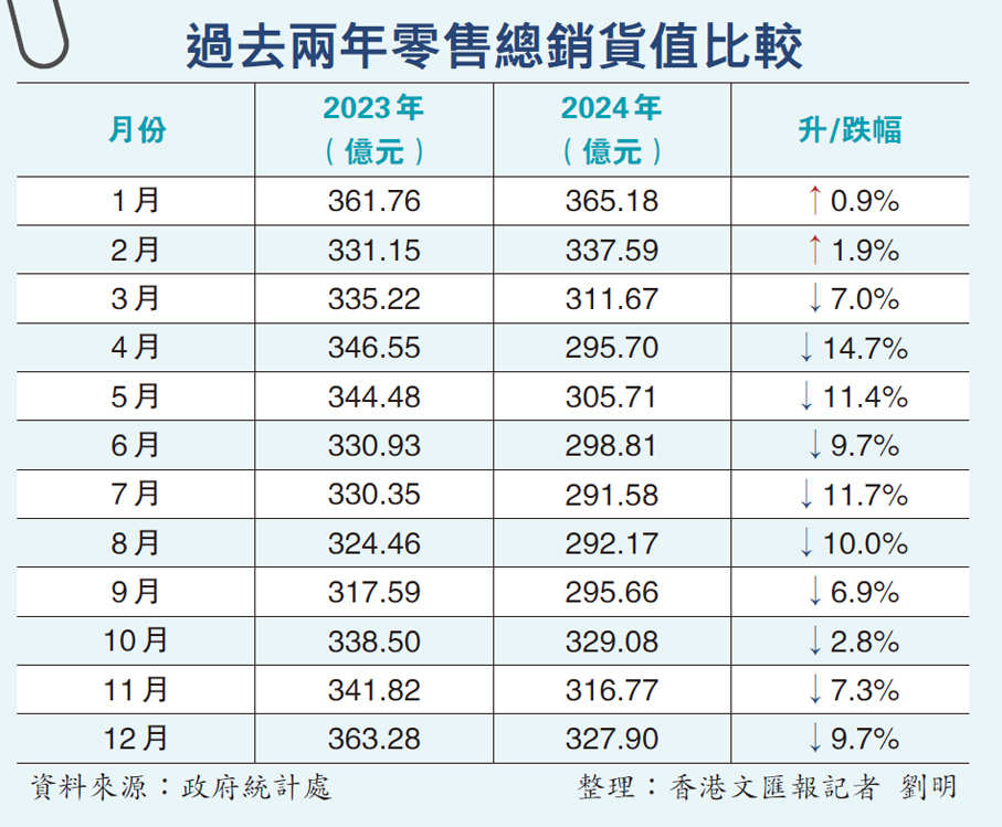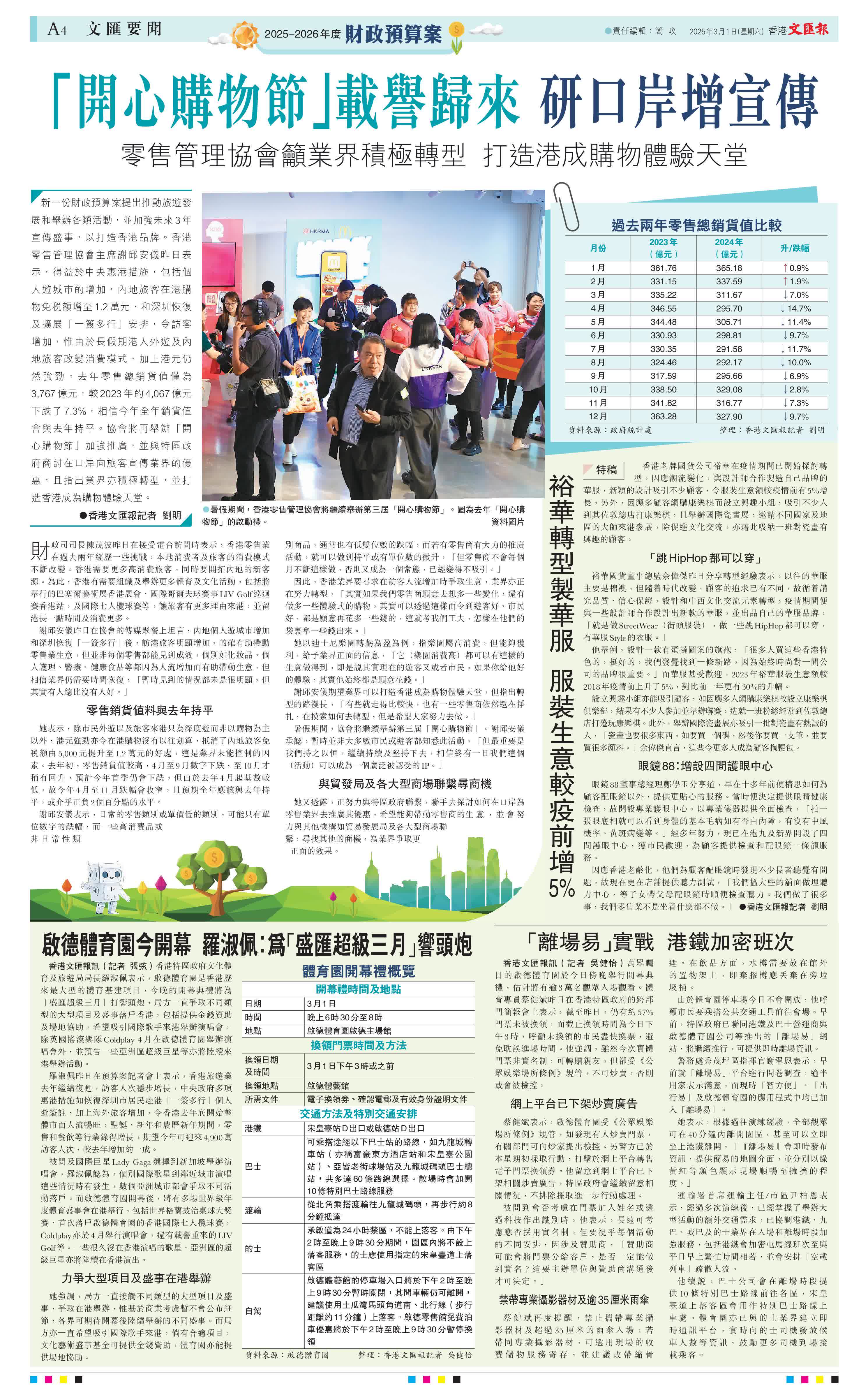 (香港文匯報記者 劉明)新一份財政預算案提出推動旅遊發展和舉辦各類活動,並加強未來3年宣傳盛事,以打造香港品牌。香港零售管理協會主席謝邱安儀昨日表示,得益於中央惠港措施,包括個人遊城巿的增加,內地旅客在港購物免稅額增至1.2萬元,和深圳恢復及擴展「一簽多行」安排,令訪客增加,惟由於長假期港人外遊及內地旅客改變消費模式,加上港元仍然強勁,去年零售總銷貨值僅為3,767億元,較2023年的4,067億元下跌了7.3%,相信今年全年銷貨值會與去年持平。協會將再舉辦「開心購物節」加強推廣,並與特區政府商討在口岸向旅客宣傳業界的優惠,且指出業界亦積極轉型,並打造香港成為購物體驗天堂。
