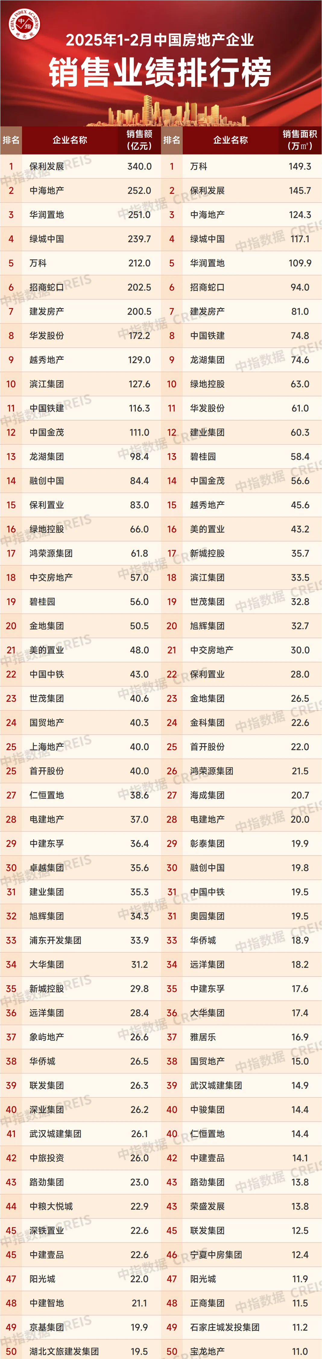(大公文匯網記者 王珏 北京報道)中指研究院28日發布2025年1-2月內地房地產企業銷售業績排行榜。數據顯示,1-2月,TOP100房企銷售總額為4479.9億元,同比下降5.9%,降幅較1月大幅收窄10.6個百分點;2月單月,TOP100房企銷售額同比增長17.3%。1-2月,保利發展、中海地產、華潤置地位居銷售業績前三名。
