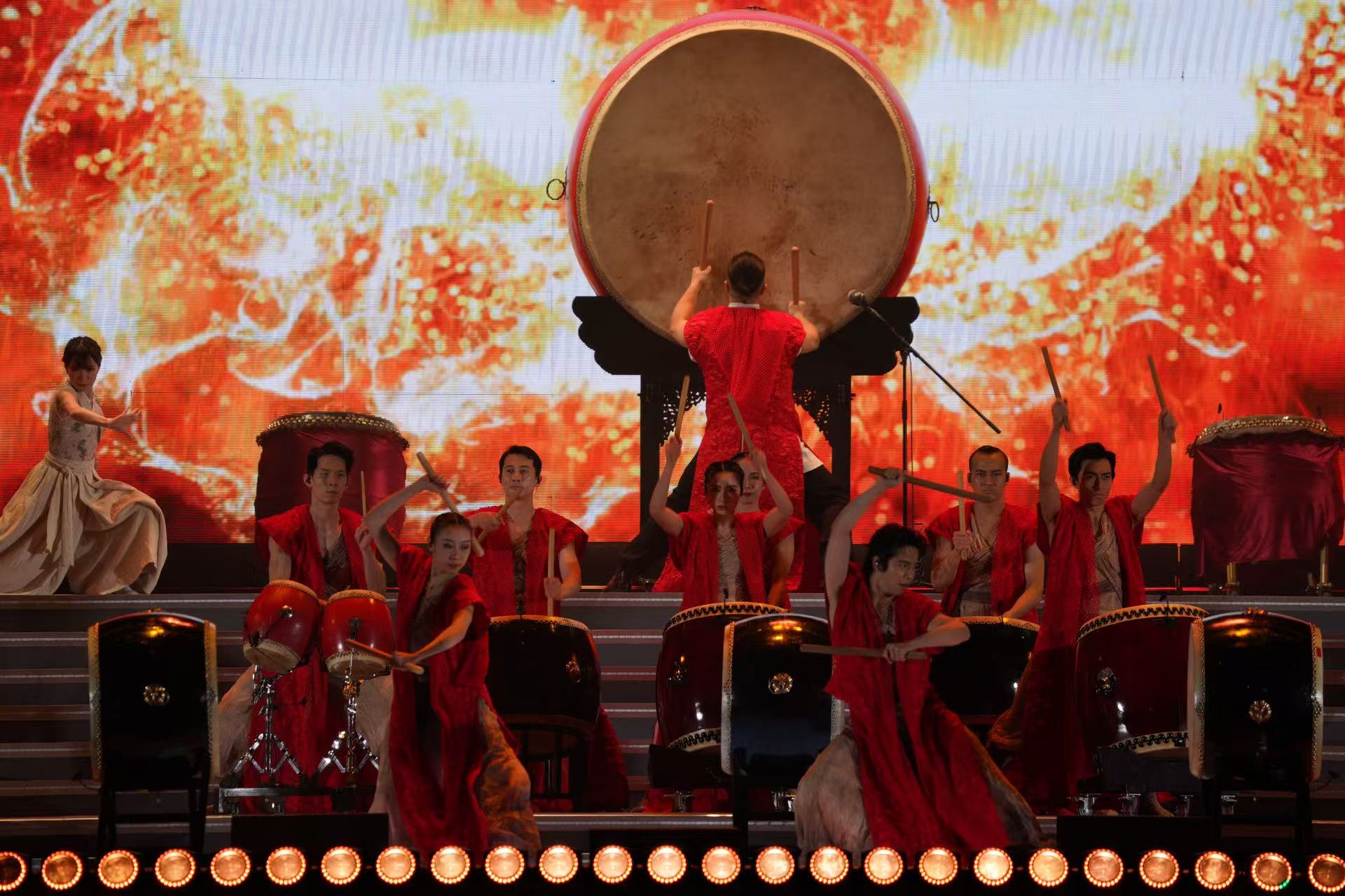 首個節目《鼓舞飛揚》更是迅速炒熱現場氛圍,舞台中央有一個巨大的圓鼓,鼓面朝向觀眾,鼓身裝飾華麗,整個場景被溫暖的燈光照亮,營造出熱烈莊重的氛圍。舞台下方的燈光設計也十分講究,一排排燈光如同繁星點點,為舞台增添了不少光彩。表演者身穿紅衣,鼓聲協調有度,雄壯有力,現場觀眾亦紛紛拿起手機拍照紀念,現場人聲鼎沸。