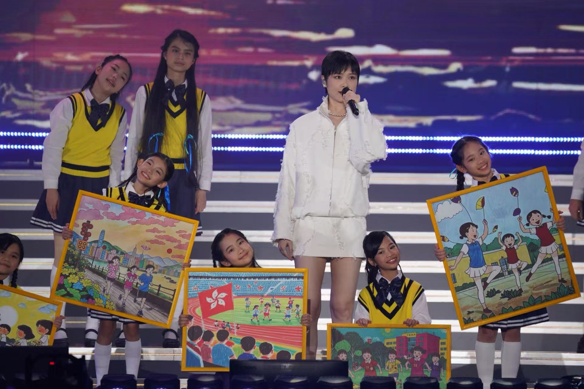 李宇春與小朋友演唱《和你一樣》,童聲如同天籟,歌曲治癒人心,溫暖純粹。小朋友們手持畫板,展示作為香港小朋友,自己成長路上的點點滴滴。