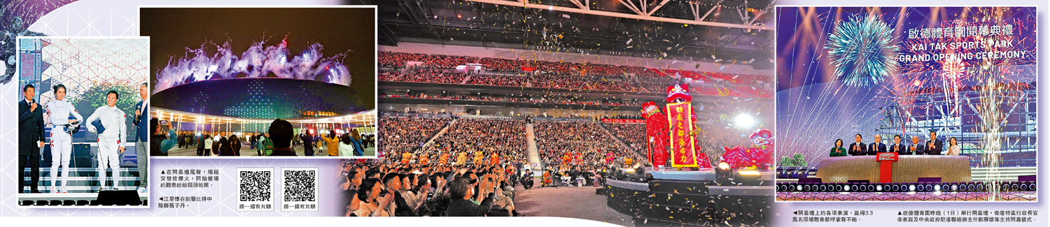 香港啟德體育園昨晚舉行開幕典禮。香港特區行政長官李家超、中央政府駐港聯絡辦主任鄭雁雄、特區政府政務司司長陳國基、立法會主席梁君彥、行政會議召集人葉劉淑儀、啟德體育園公司主席鄭家純等出席並主禮。中央駐港機構相關負責人、特區政府有關官員、社會各界嘉賓及三萬多名觀眾現場觀看演出。