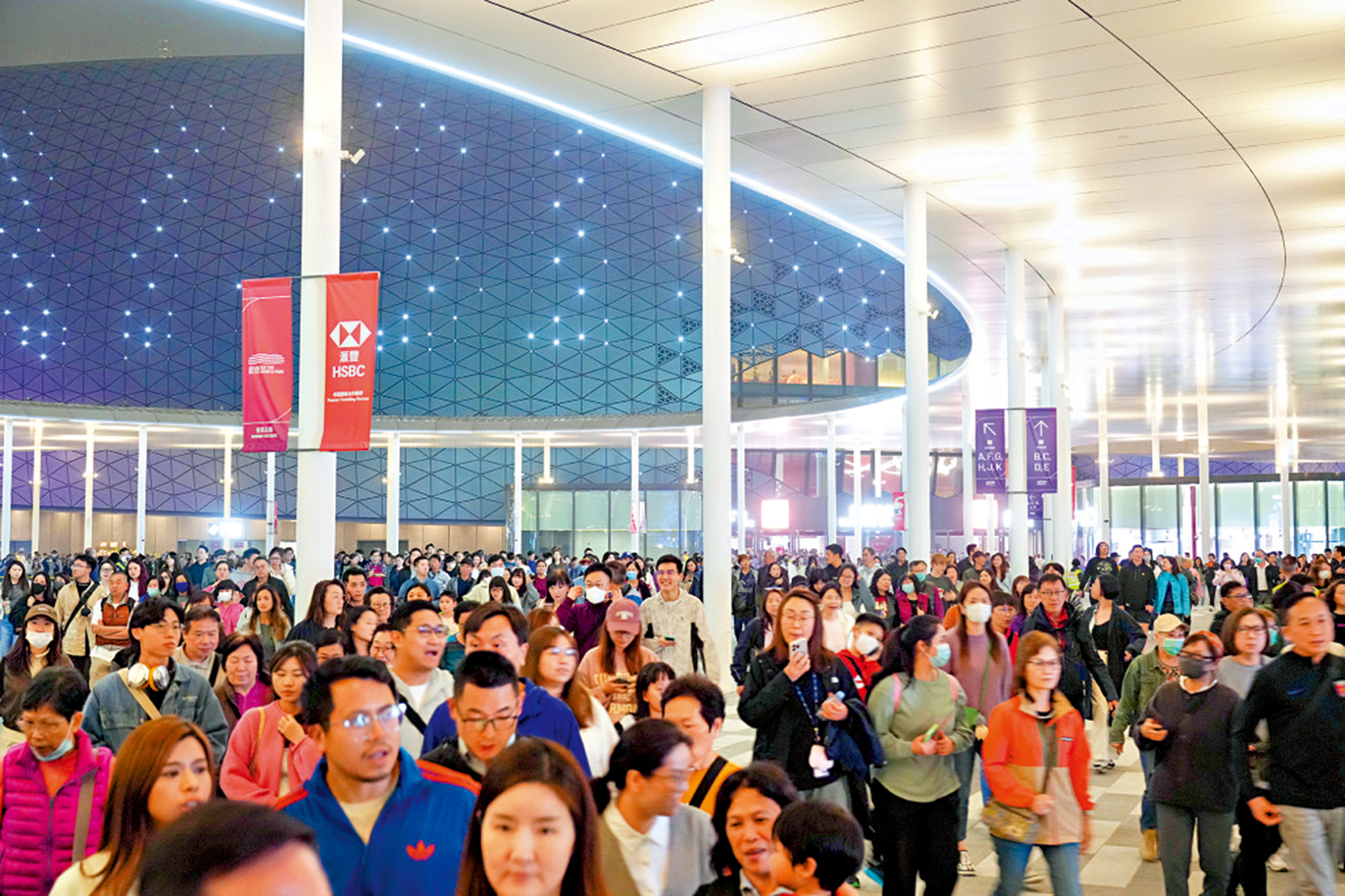 觀眾人潮昨天下午陸續湧現,主場館外氣氛歡欣,有觀眾拿着開幕禮門票、運動員明星相片、歌手橫額等興奮打卡。大會比原定時間提早半小時開放入場。
