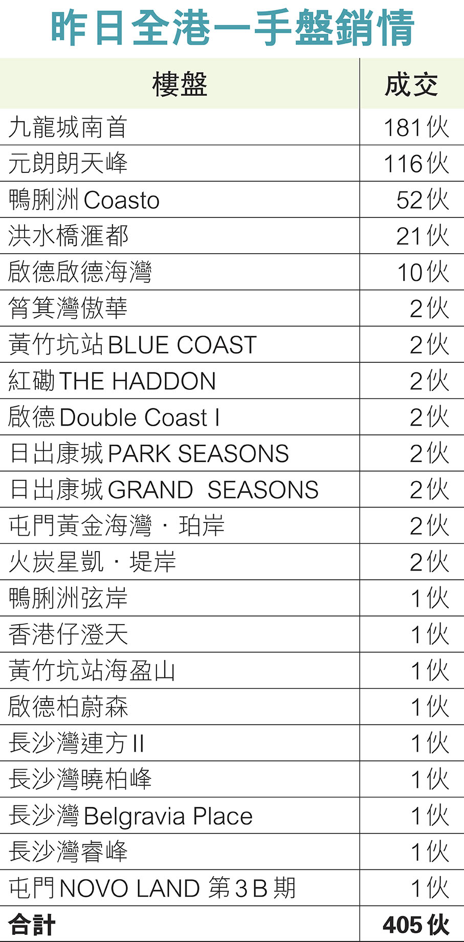 (香港文匯報 記者 馬翠媚、梁悅琴)財政預算案公布後首個周末,至少5個新盤合共584伙齊齊推售,部分港九新界細價新盤單位受惠於新財案將400萬元或以下物業印花稅降至100元,它們的售樓處都出現逼爆的熱鬧場面,帶動整體一手銷情氣氛向好,全港新盤昨天合共售出405伙,為自去年10月公布施政報告後單日最旺成交。其中,首度開售的九龍城「南首」首批181伙全數沽清、鴨脷洲「Coasto」首批60伙售出86%單位,而屬次輪推售的元朗「朗天峰」,今批121伙亦售出逾95%單位。