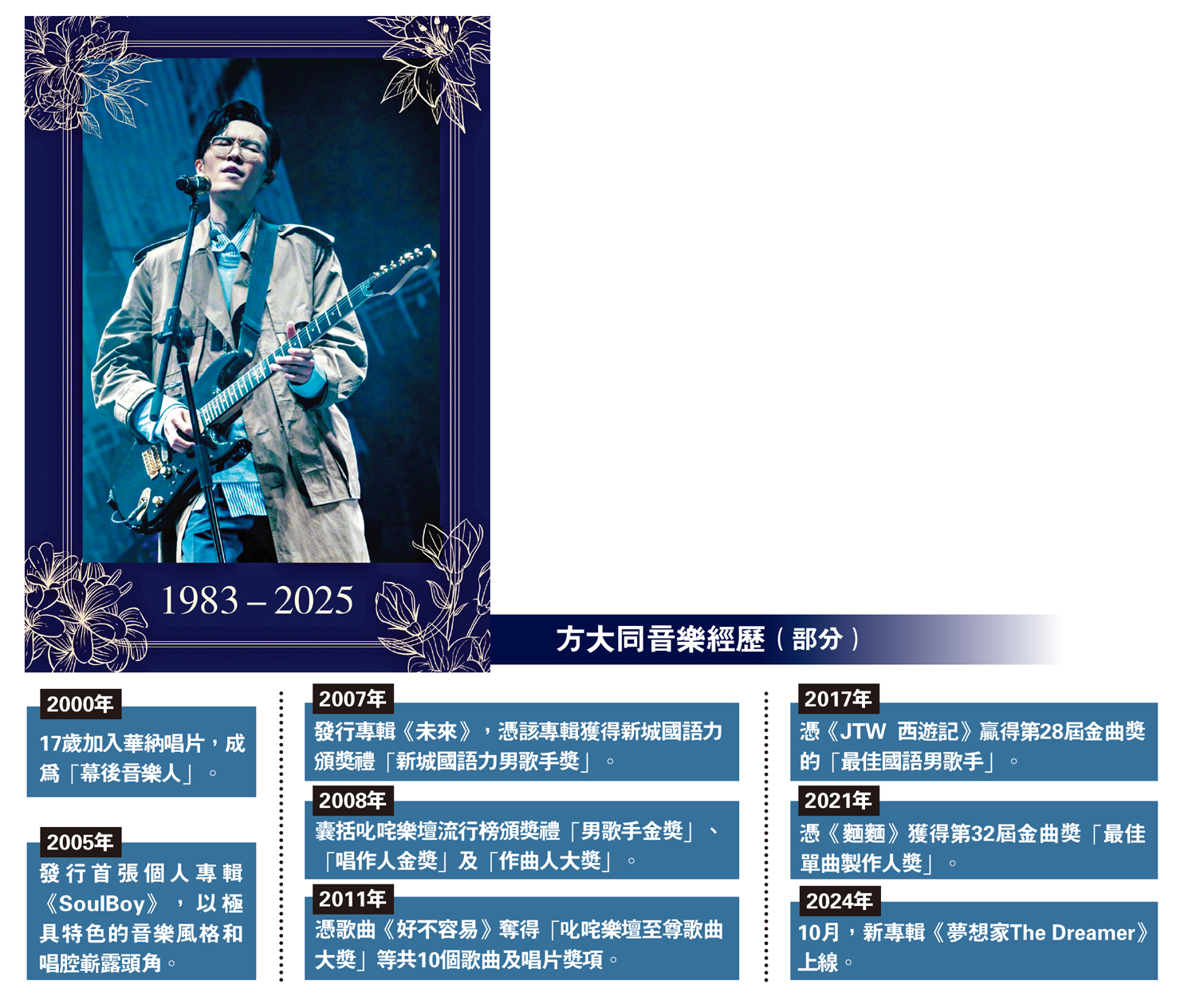 (大公報 記者 顏琨)被譽為「樂壇才子」的香港創作歌手方大同於21日逝世,終年41歲。其個人音樂廠牌賦音樂有限公司昨日發文公布方大同去世的消息,「以積極的態度面對頑疾5年,方大同於2025年2月21日早晨,平靜而安詳地離開了這個世界,前往生命旅程的另外一個領域,繼續他的使命與夢想。他所留下的音樂與圖畫小說是永恆的精神財富。」