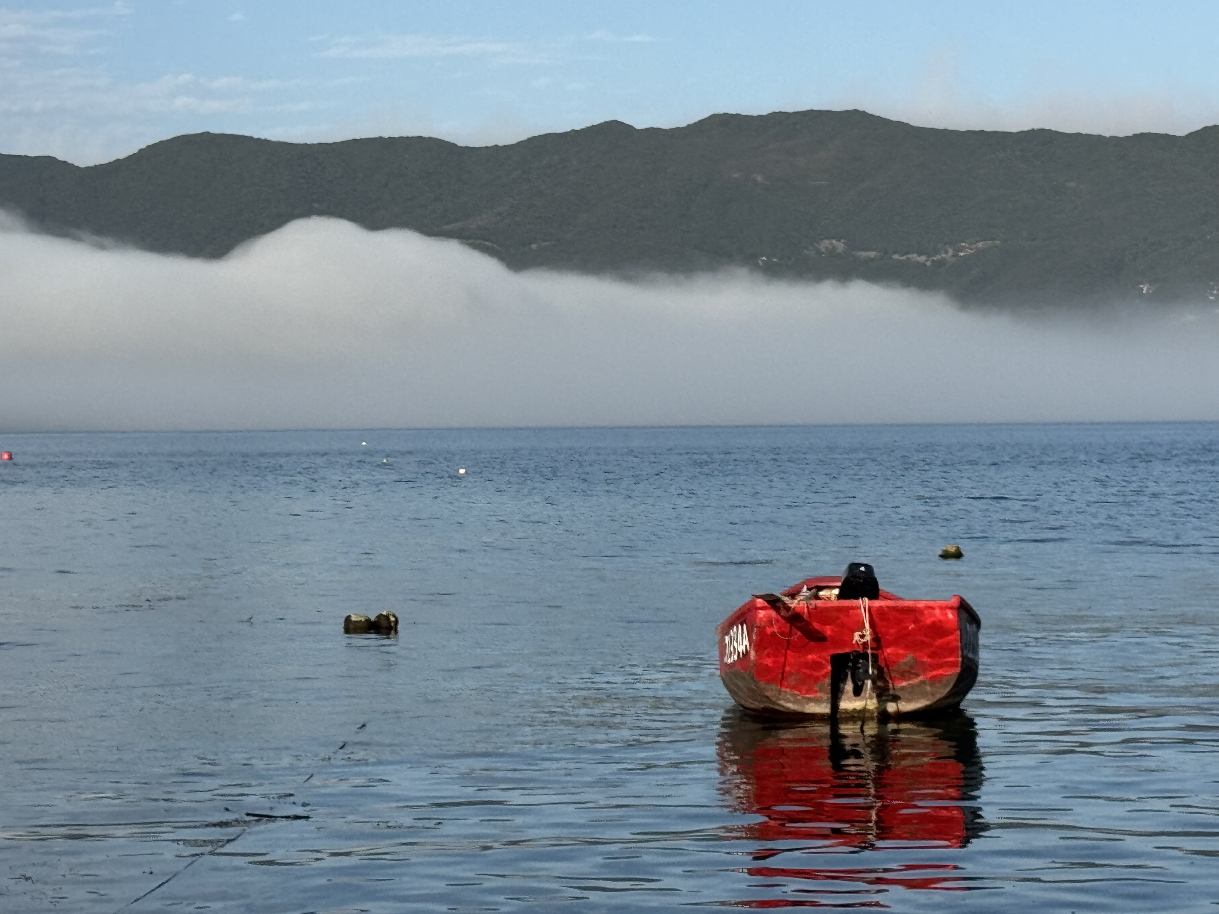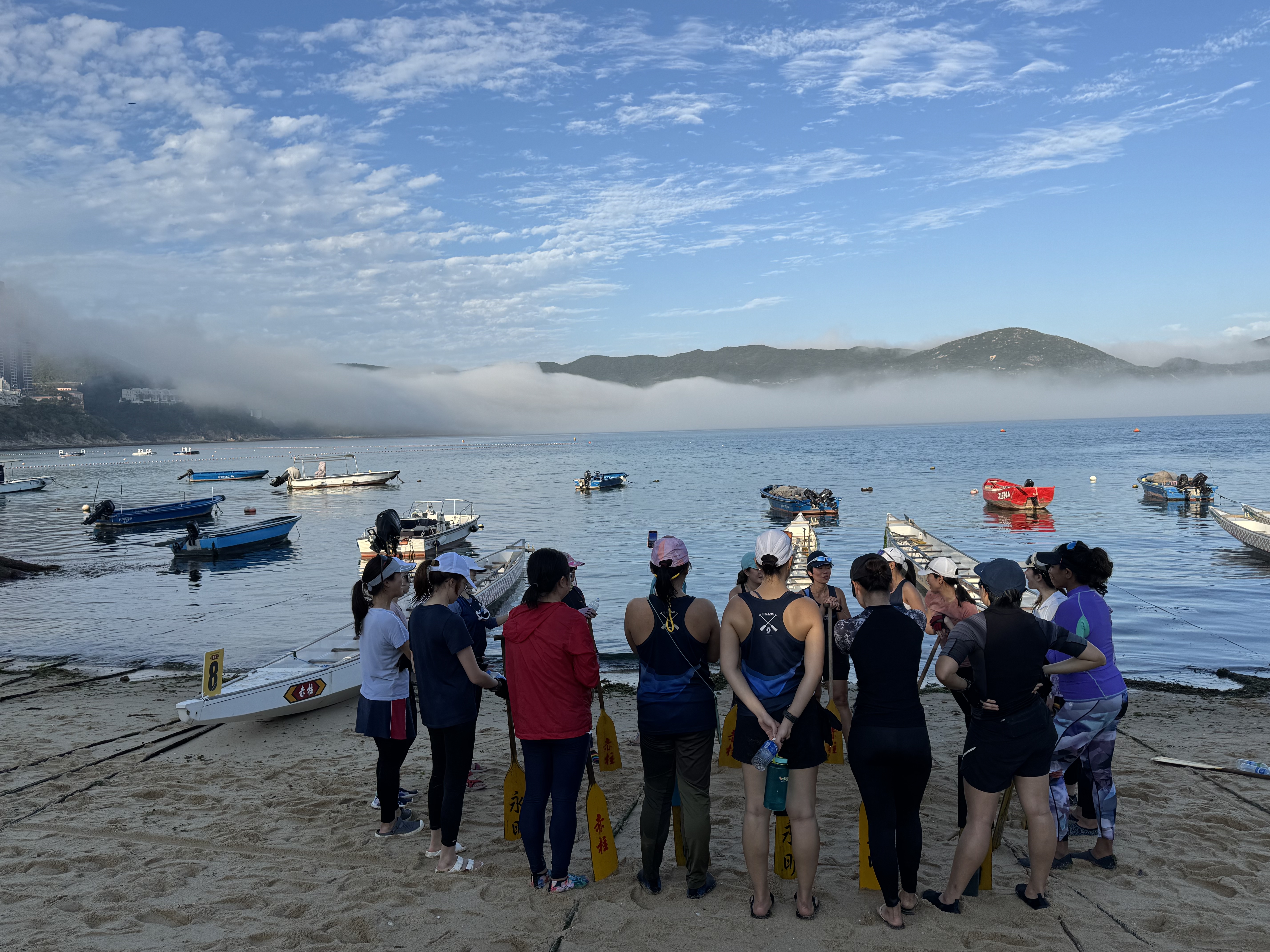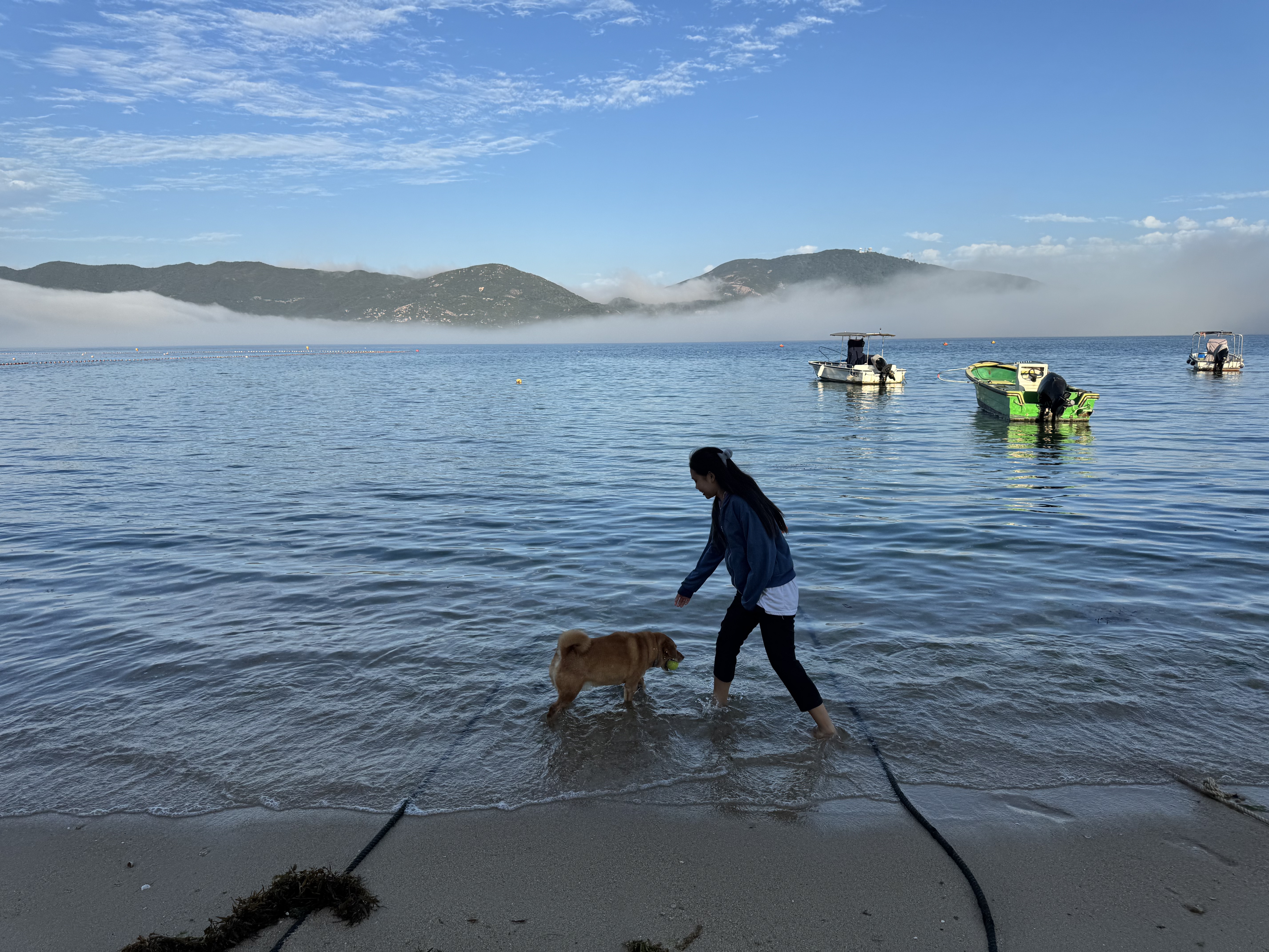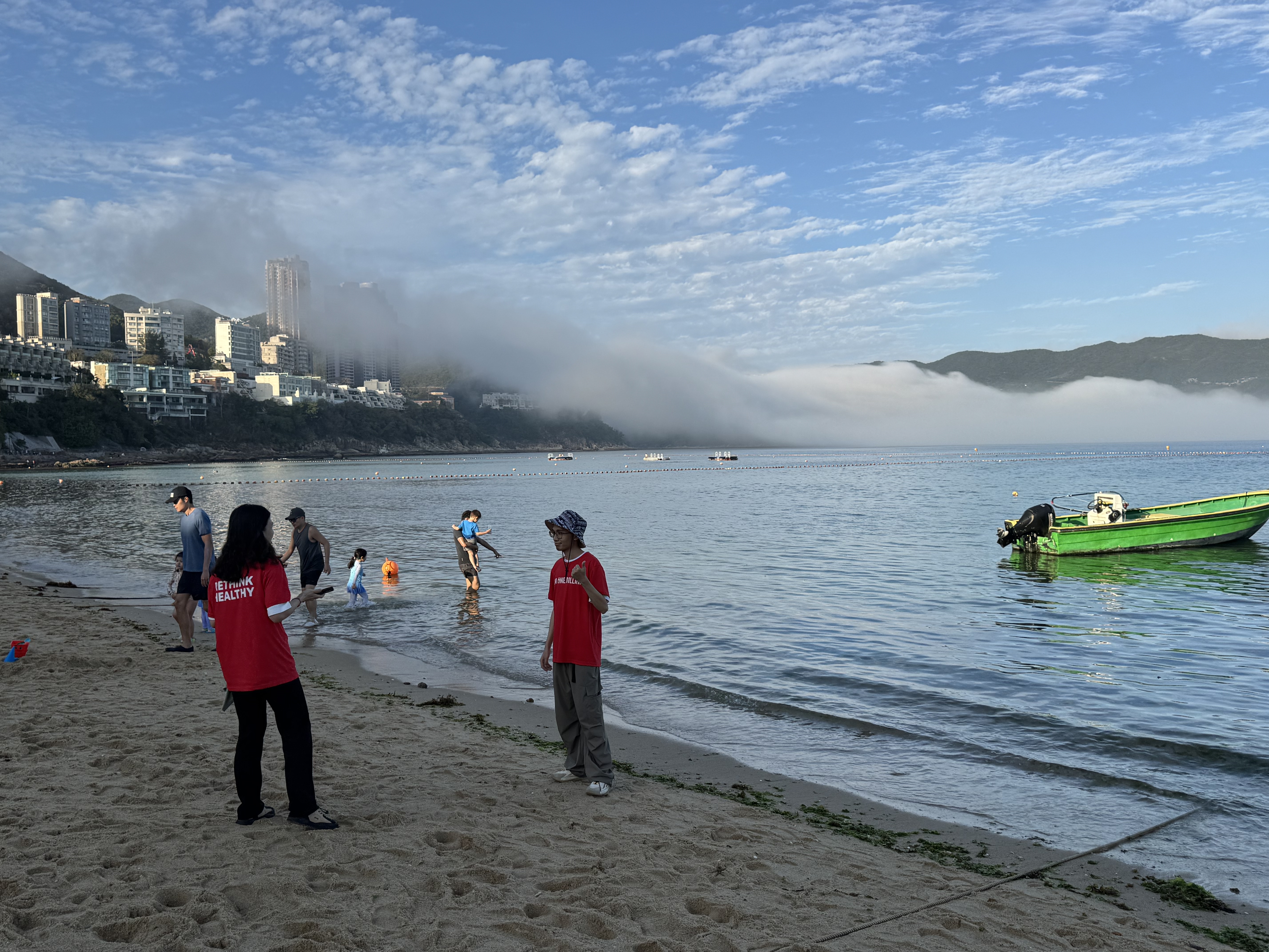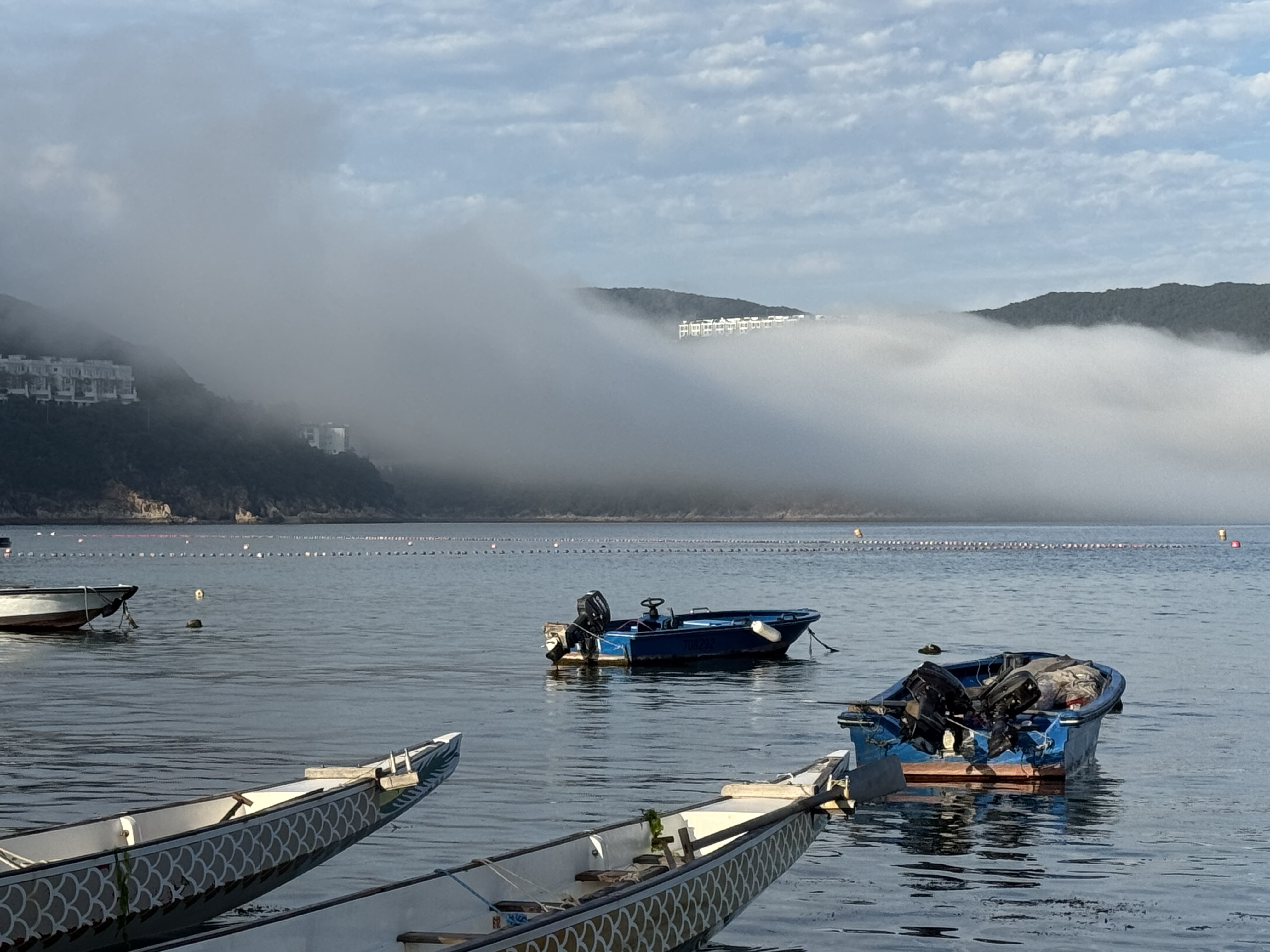 大公文匯全媒體報道,回南天殺到!今日(2日)港島南海面出現「霧牆」,在陽光下仍久不消散,沿海面蔓延至岸邊甚至山坡。記者在赤柱正灘附近看到,在霧氣已經消散的區域,有市民正進行水上活動,而他們身後就是似牛奶一般濃稠的白霧。