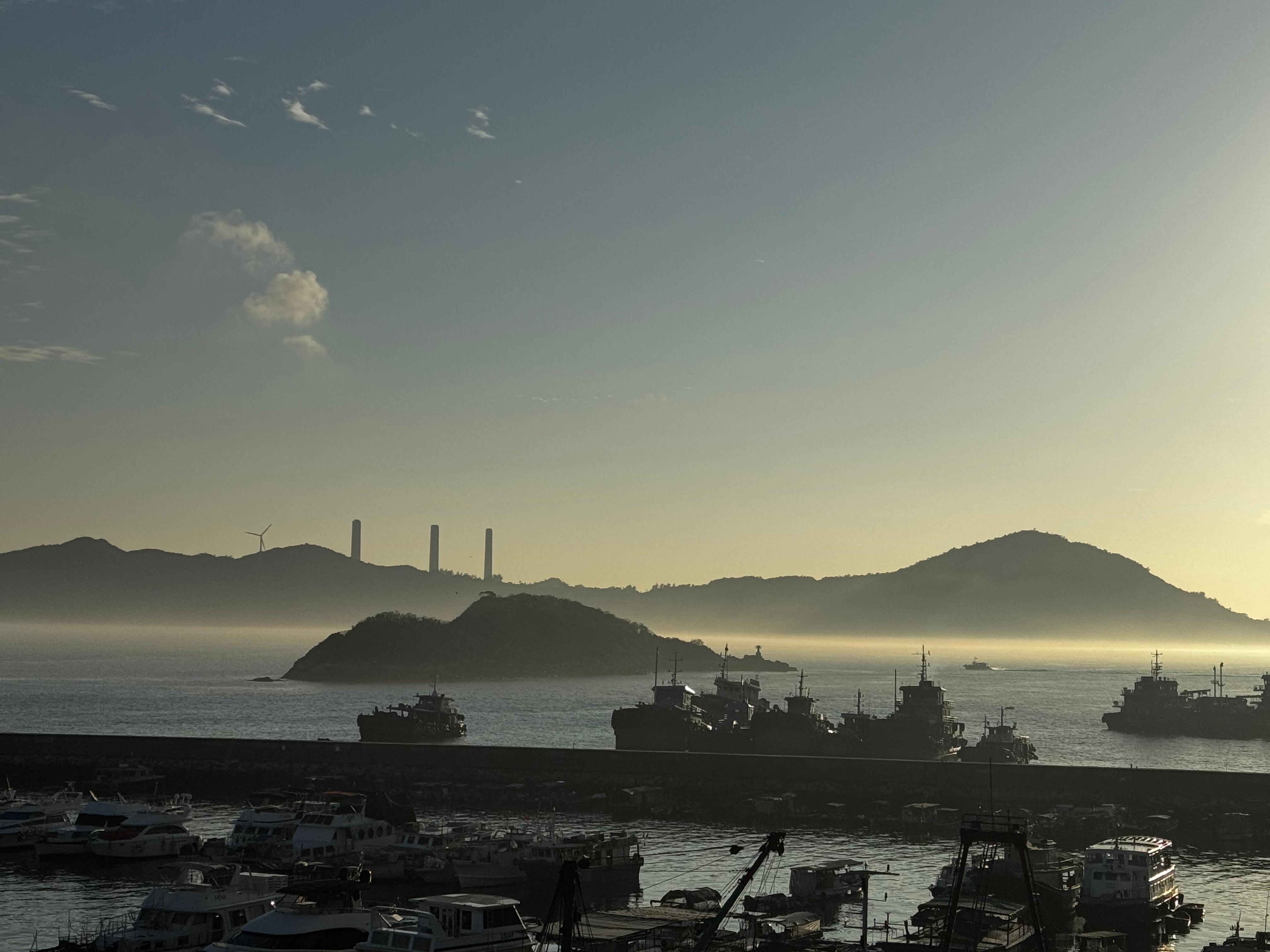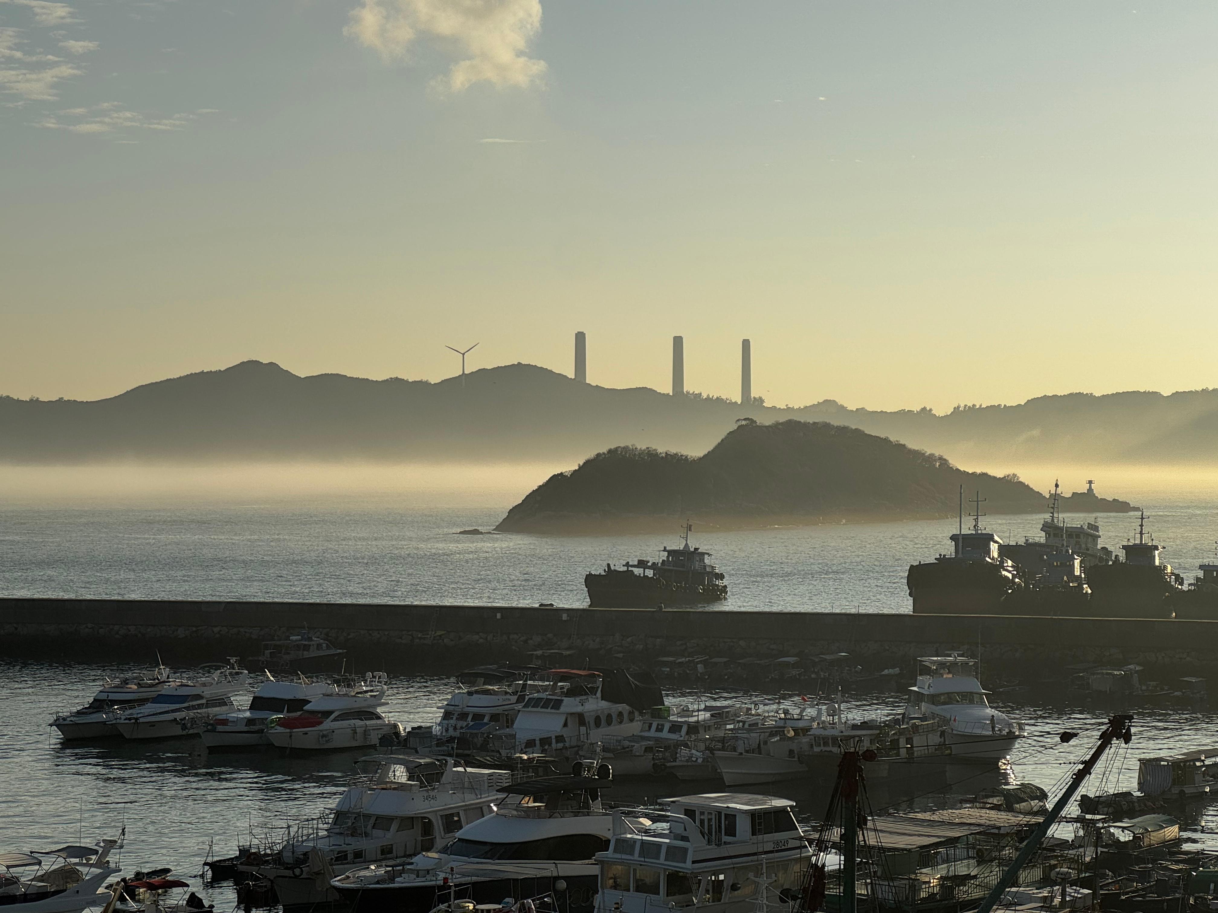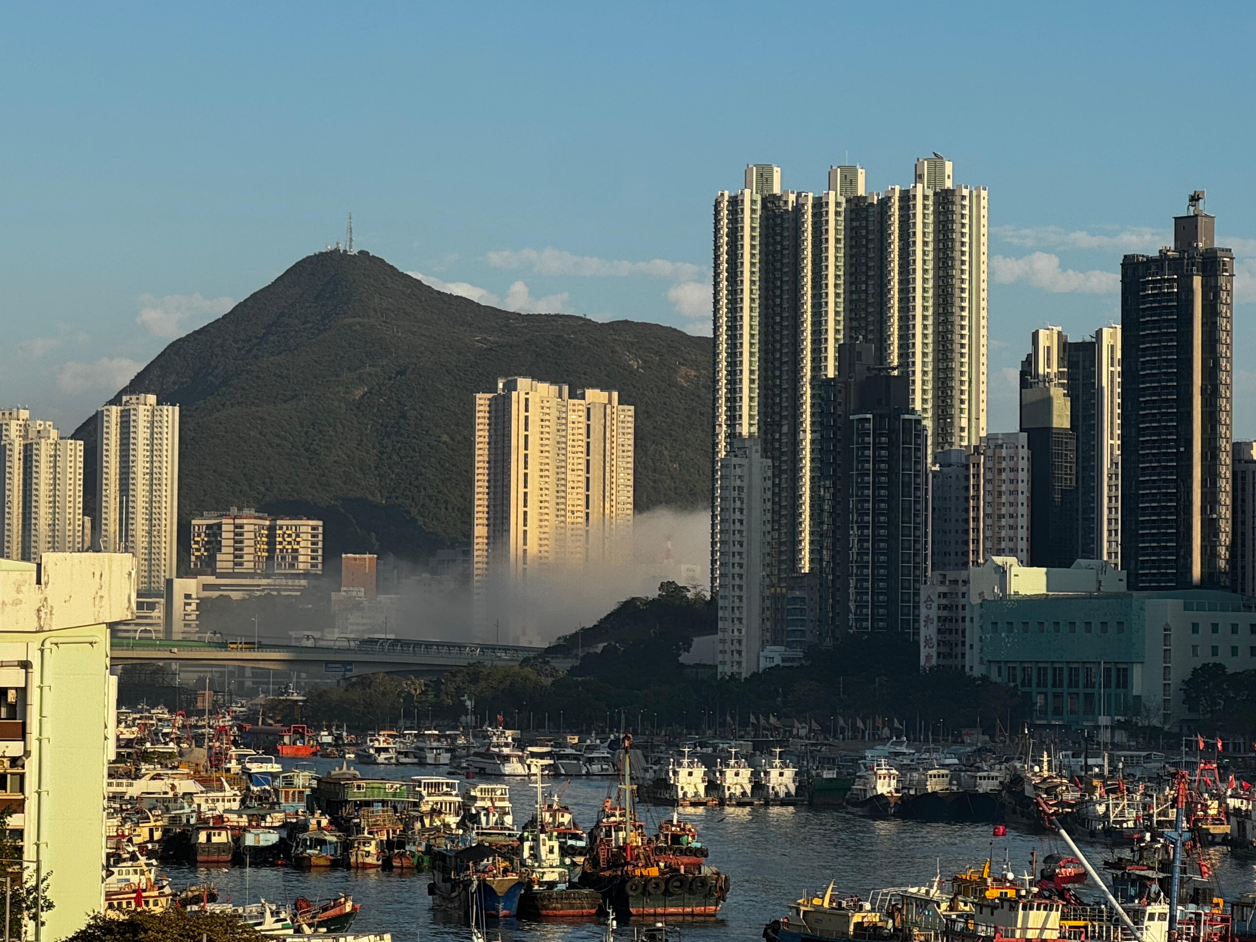 香港仔往南丫島方向和鴨脷洲方向的海面也能看到部分「霧牆」,橫臥在水面上將島嶼和海面劃開,又因陽光的照射散發淡淡金光,像天上的雲朵落到了海裏。