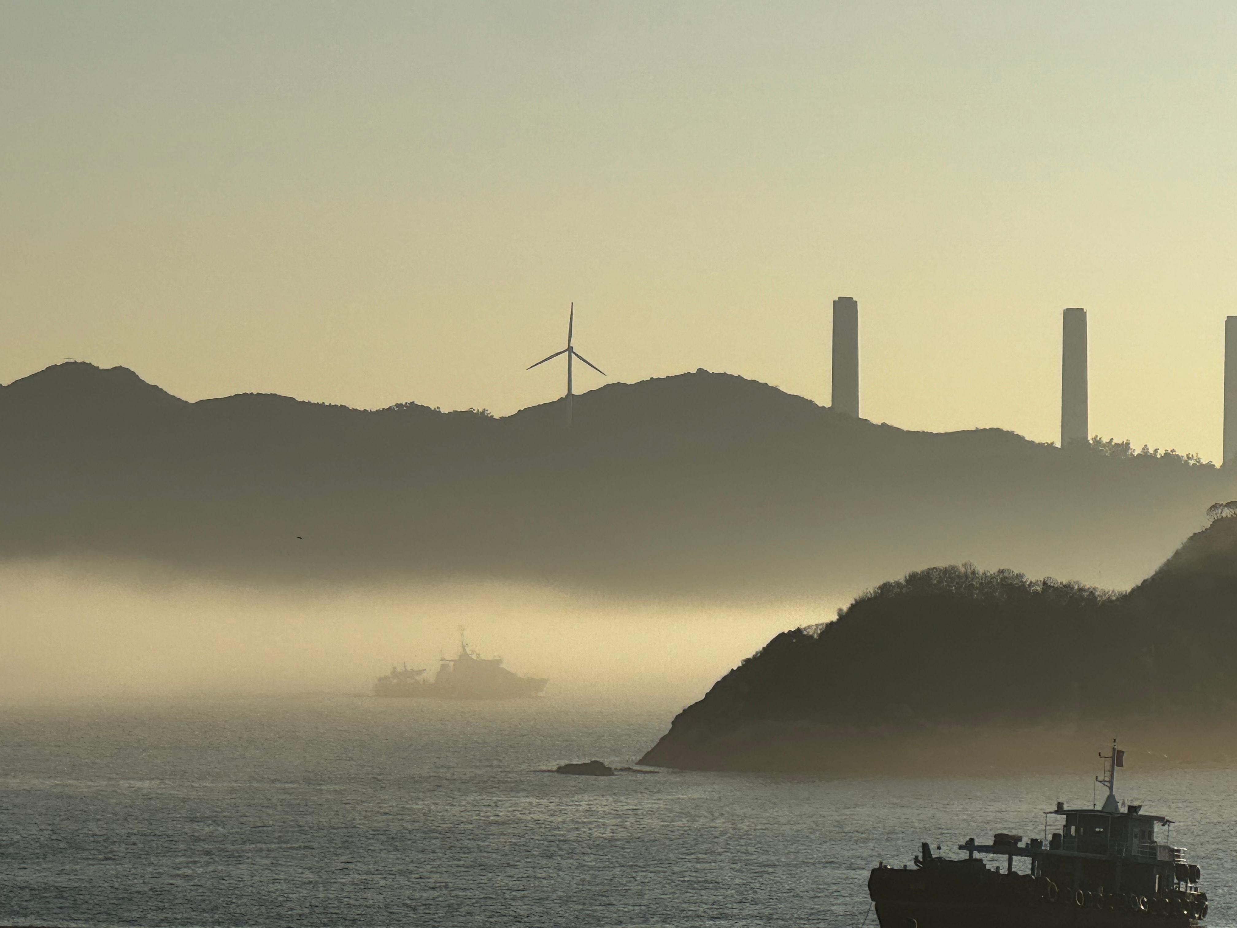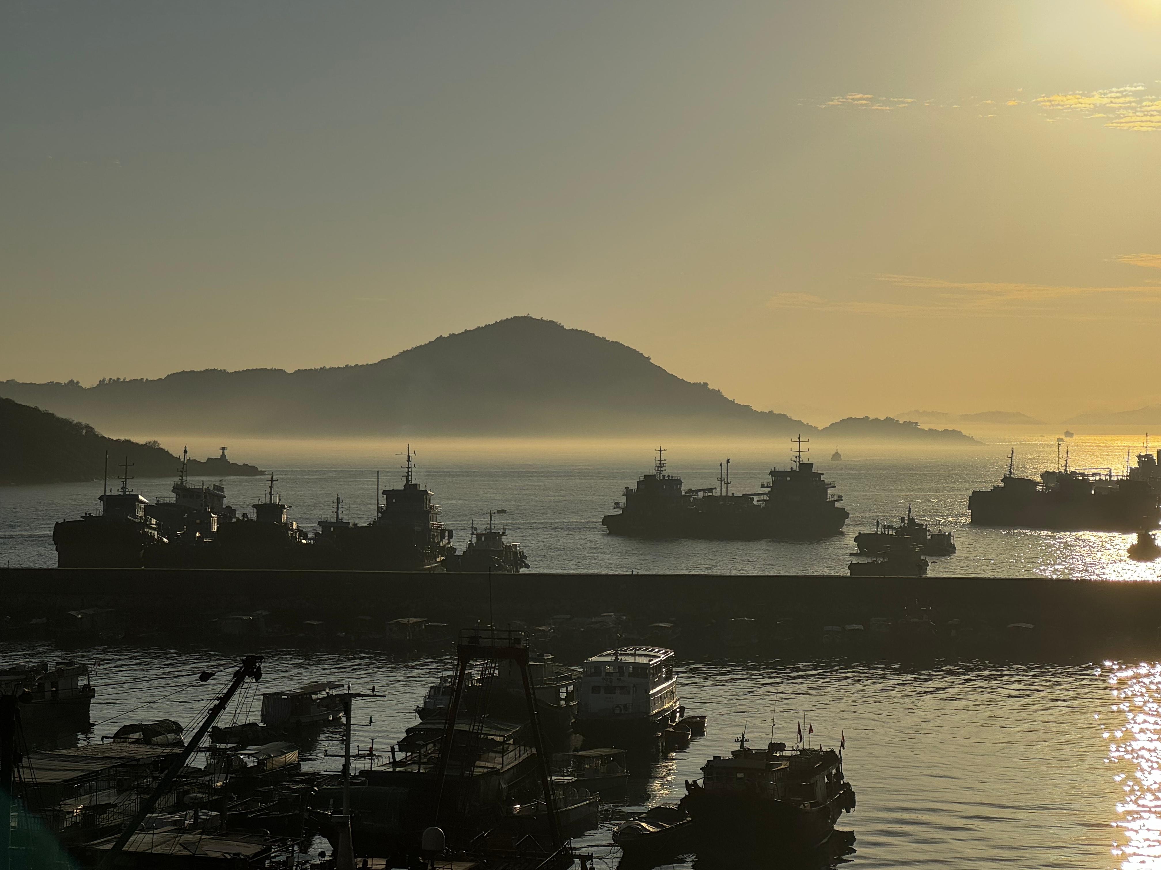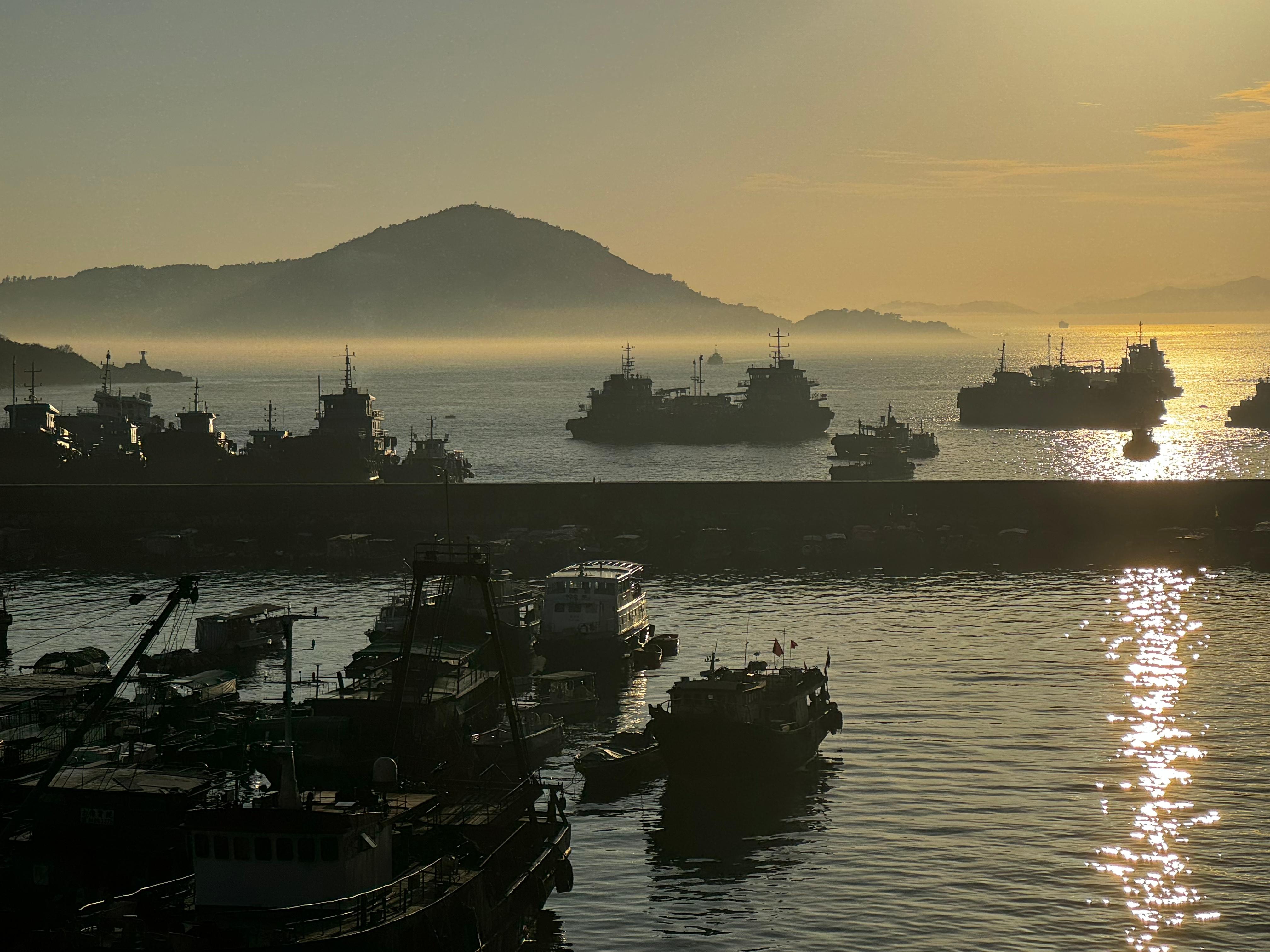 香港仔往南丫島方向和鴨脷洲方向的海面也能看到部分「霧牆」,橫臥在水面上將島嶼和海面劃開,又因陽光的照射散發淡淡金光,像天上的雲朵落到了海裏。