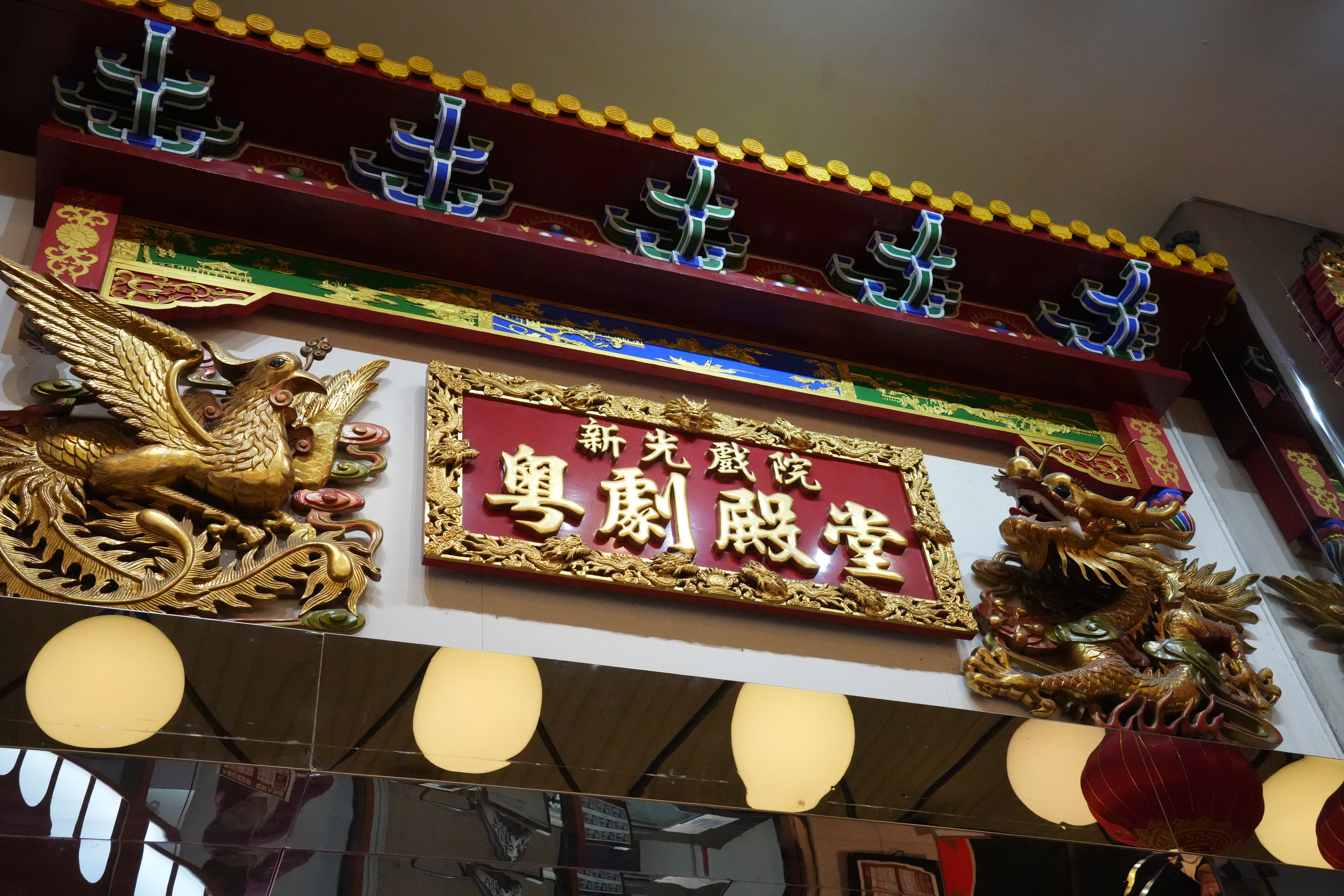 1樓的粵劇劇院有1033個座位,舞台前方的樂池是放置樂器,讓樂手演奏的地方,鐵欄處保留着鐵花裝飾。在這裏,曾經上演多齣經典劇目,舞台兩側掛着一副對聯,「新詞繾綣情傾俊彥芳尊臨勝地,光樂鏗鏘愛染嫣紅奼紫耀銀天」,盡顯粵劇殿堂的氣派。