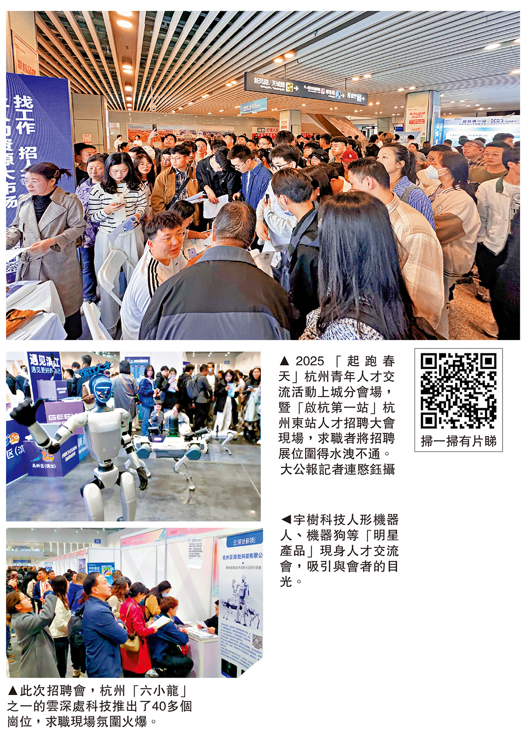 (大公報記者 連愍鈺杭州報道)近日,浙江杭州人才招聘市場熱火朝天。1日,杭州今年新春最大規模線下人才招聘會─2025「起跑春天」杭州青年人才交流活動在大會展中心舉辦,830家參會單位、2.1萬個崗位,吸引了超3.5萬人前來求職。2日,上城分會場暨「啟杭第一站」杭州東站人才招聘大會現場人頭攢動。杭州「六小龍」宇樹科技、雲深處、強腦科技、群核科技等新銳科企展位前被擠得水洩不通。
