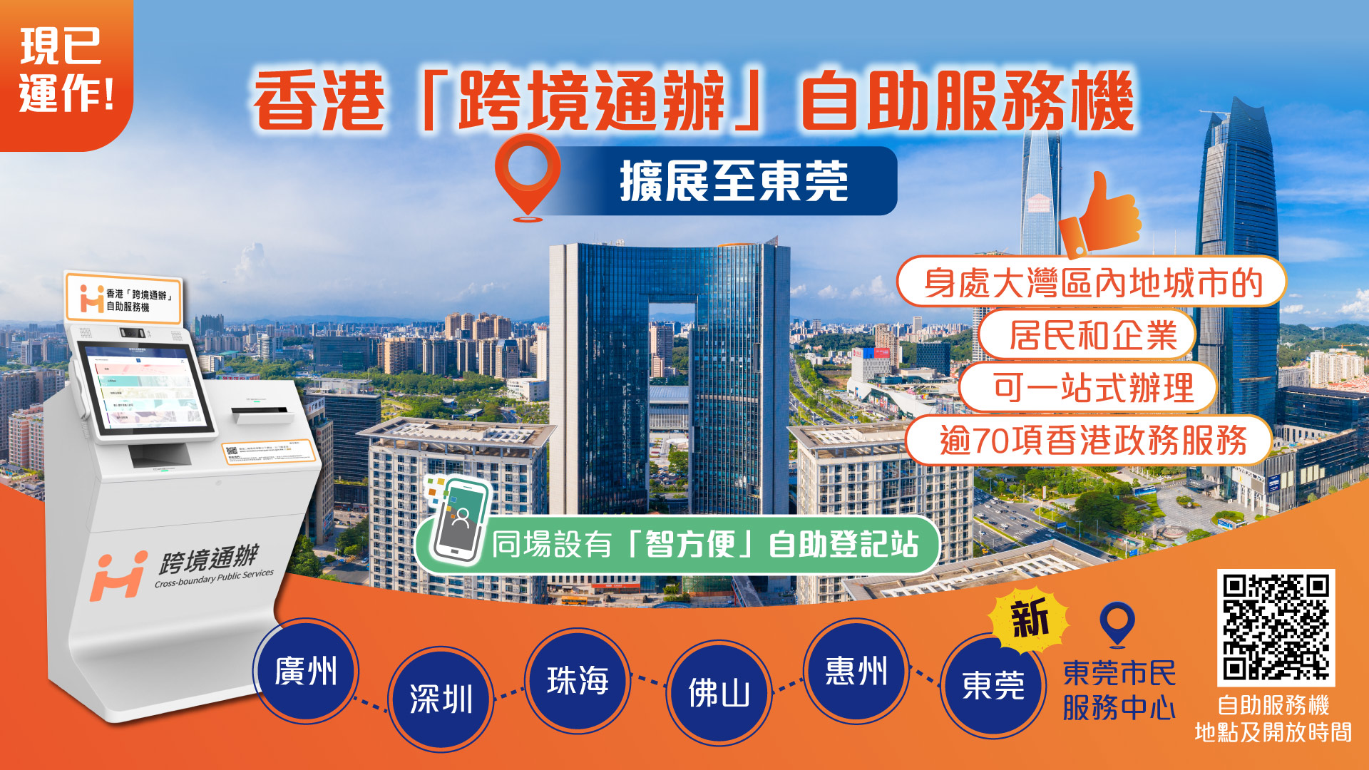 香港「跨境通辦」自助服務機現已擴展至東莞,方便身處粵港澳大灣區內地城市的居民和企業,無須親身到港,便可一站式申辦逾70項香港政務服務。