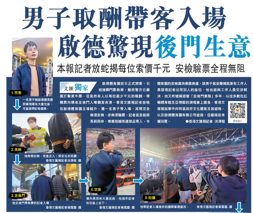 啟德體育園前日正式開幕,引起搶購門票熱潮。警方於2月24日以涉嫌企圖詐騙拘捕3人,指他們在網上以100至2000元出售門票的電子換領券,其中兩人根本沒有門票。惟開幕禮當日,香港文匯報記者在啟德體育園主場館外,獲一名男子帶入場,其間完全無須安檢,亦無須驗票,甚至將長柄雨傘、專業相機等違禁品帶入,令體育園的安檢漏洞暴露無遺。該男子吹噓稱經營「走後門業務」多年,以往多數在紅磡體育館及亞博館的演唱會上搵食。