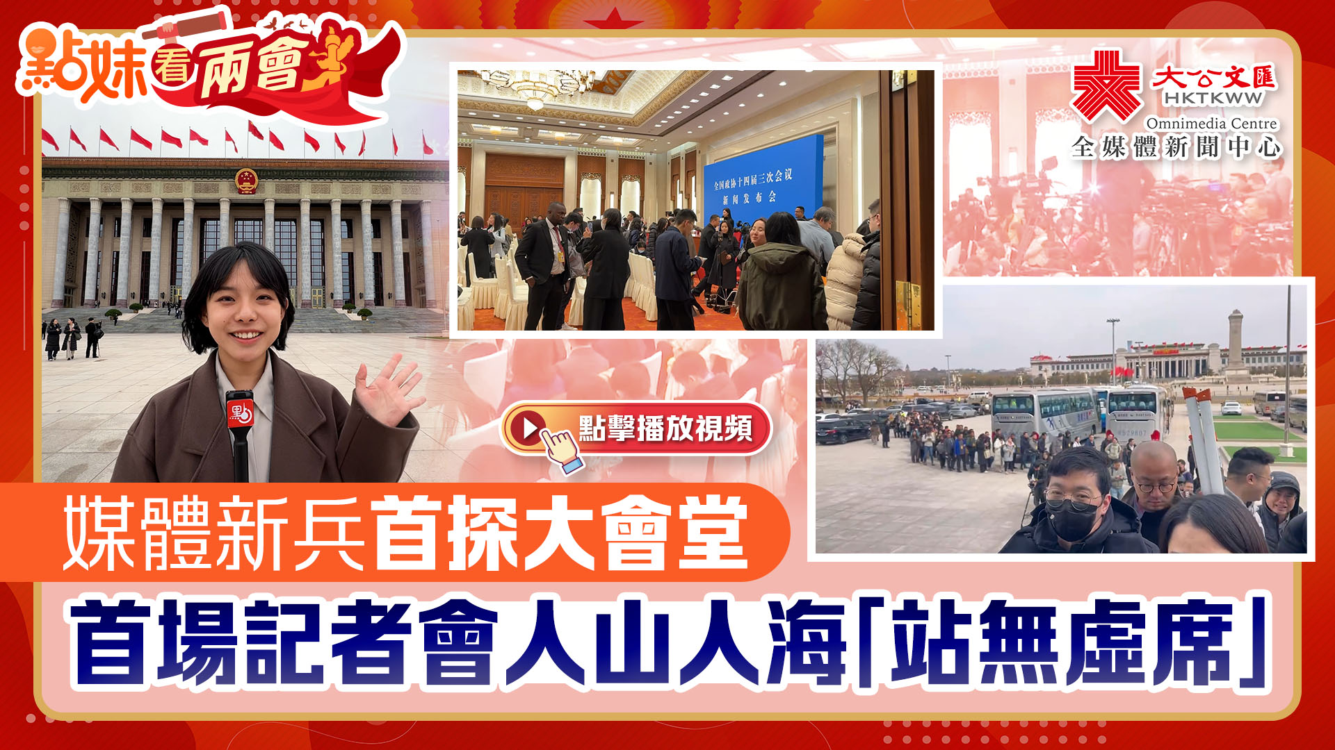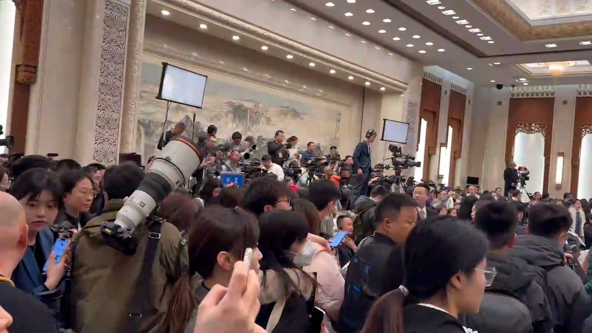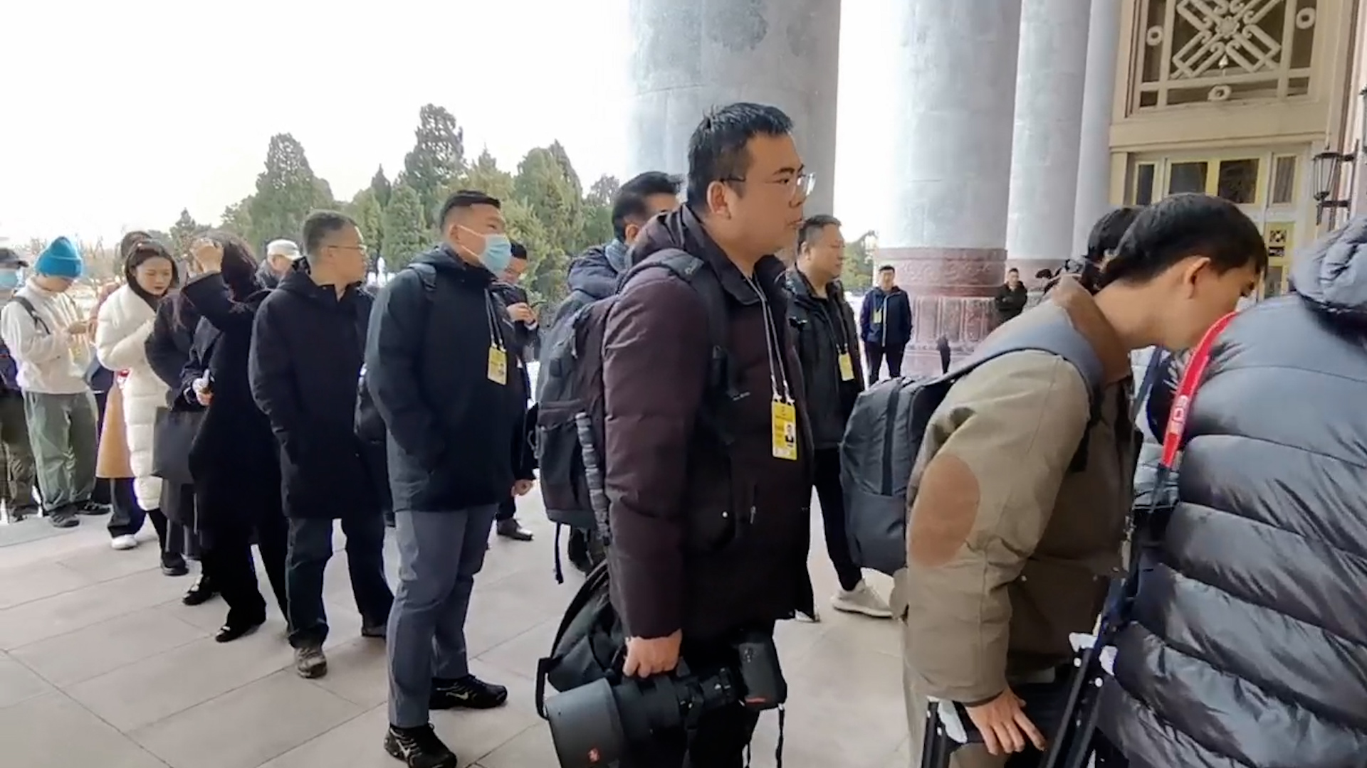 今日北京的下午雖有陽光,但空氣中仍有寒意,離入場還有大半個鐘,大會堂外的路邊,已經有多位記者排成一條長龍,從閘口一直延伸到遠處。有人背負沉重的攝影器材,有人拖裝滿設備的行李箱,還有人不斷整理自己的西裝,他們的目標只有一個——快速衝入人民大會堂,霸佔絕佳採訪位置。