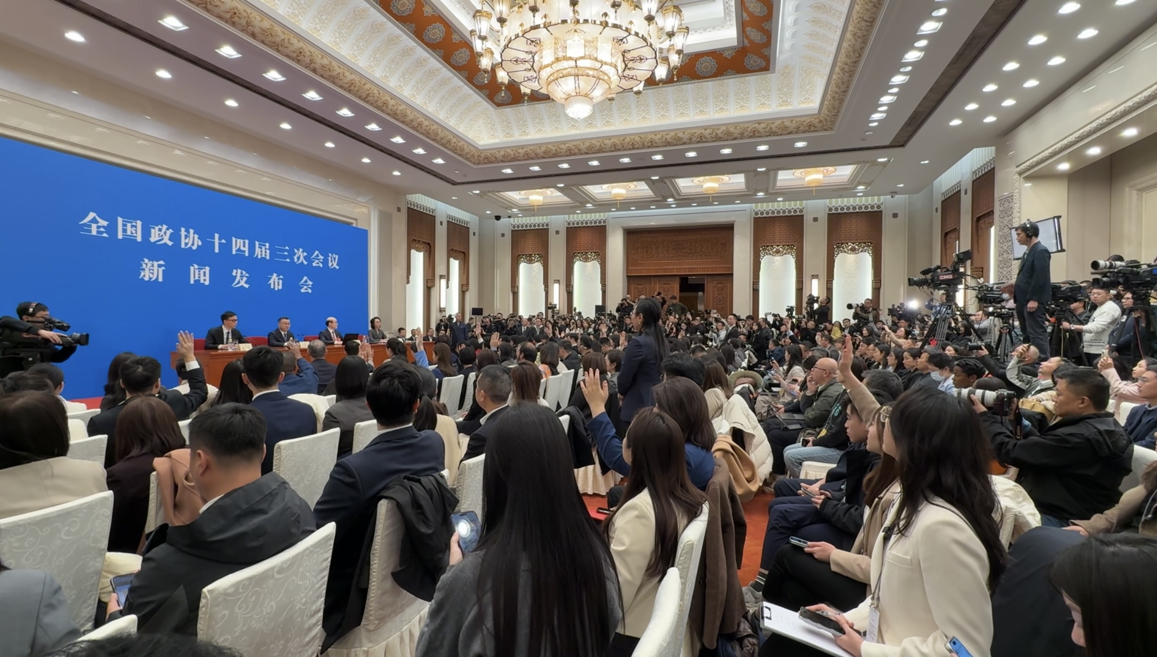 (大公文匯全媒體 記者 蘇婷 北京報道)全國政協十四屆三次會議新聞發布會3日下午3時在人民大會堂一層新聞發布廳舉行。現場約200個座位早早被坐滿,沒有座位的記者們只能站在會場兩邊,整個新聞發布廳被圍得水洩不通。人擠人,器材擠器材,感覺現場氣溫都高了些許。