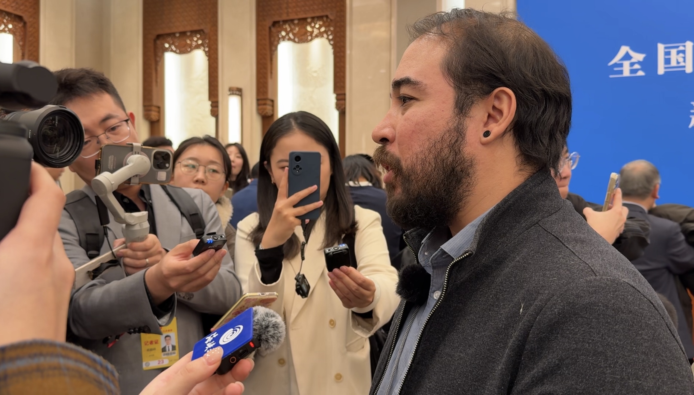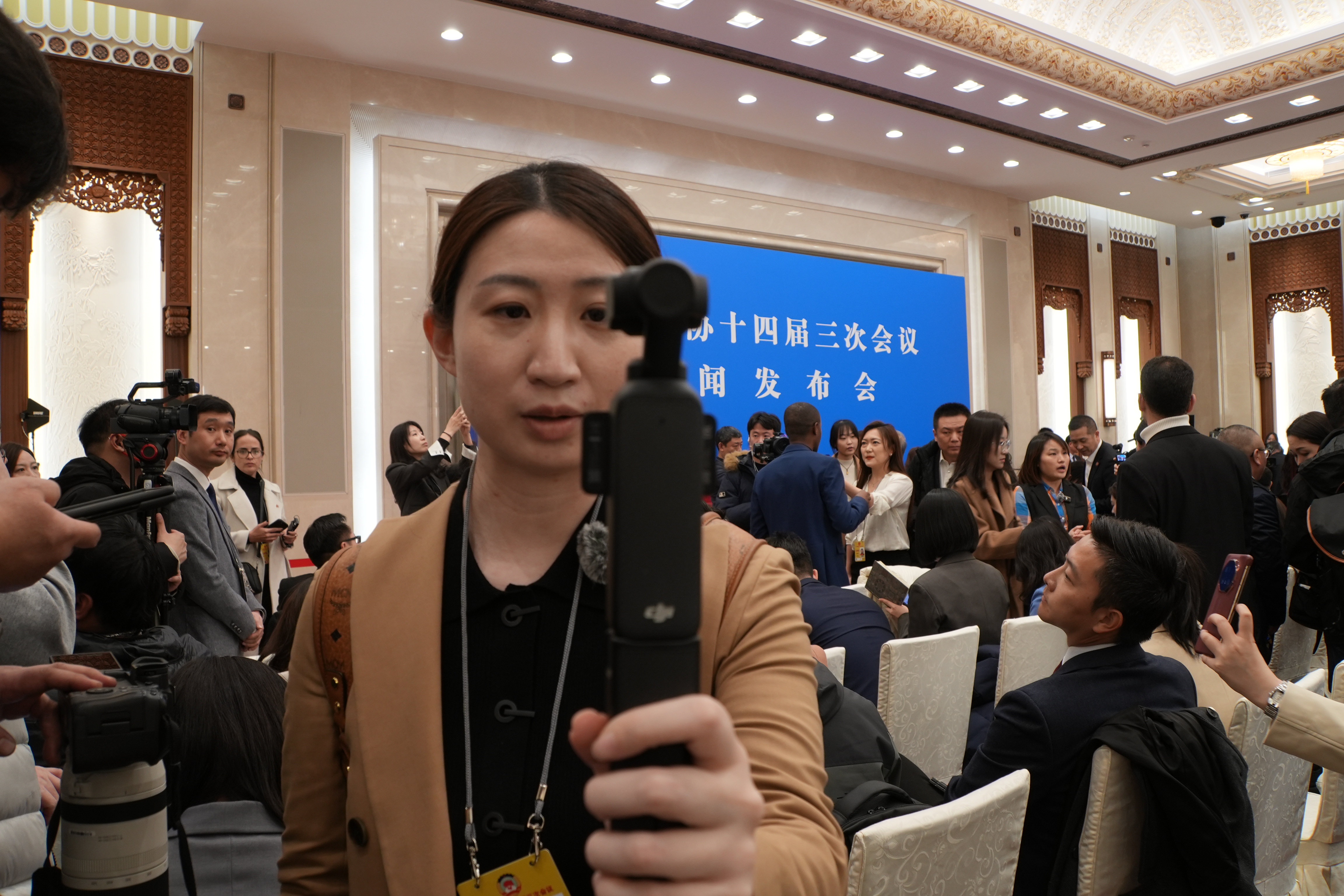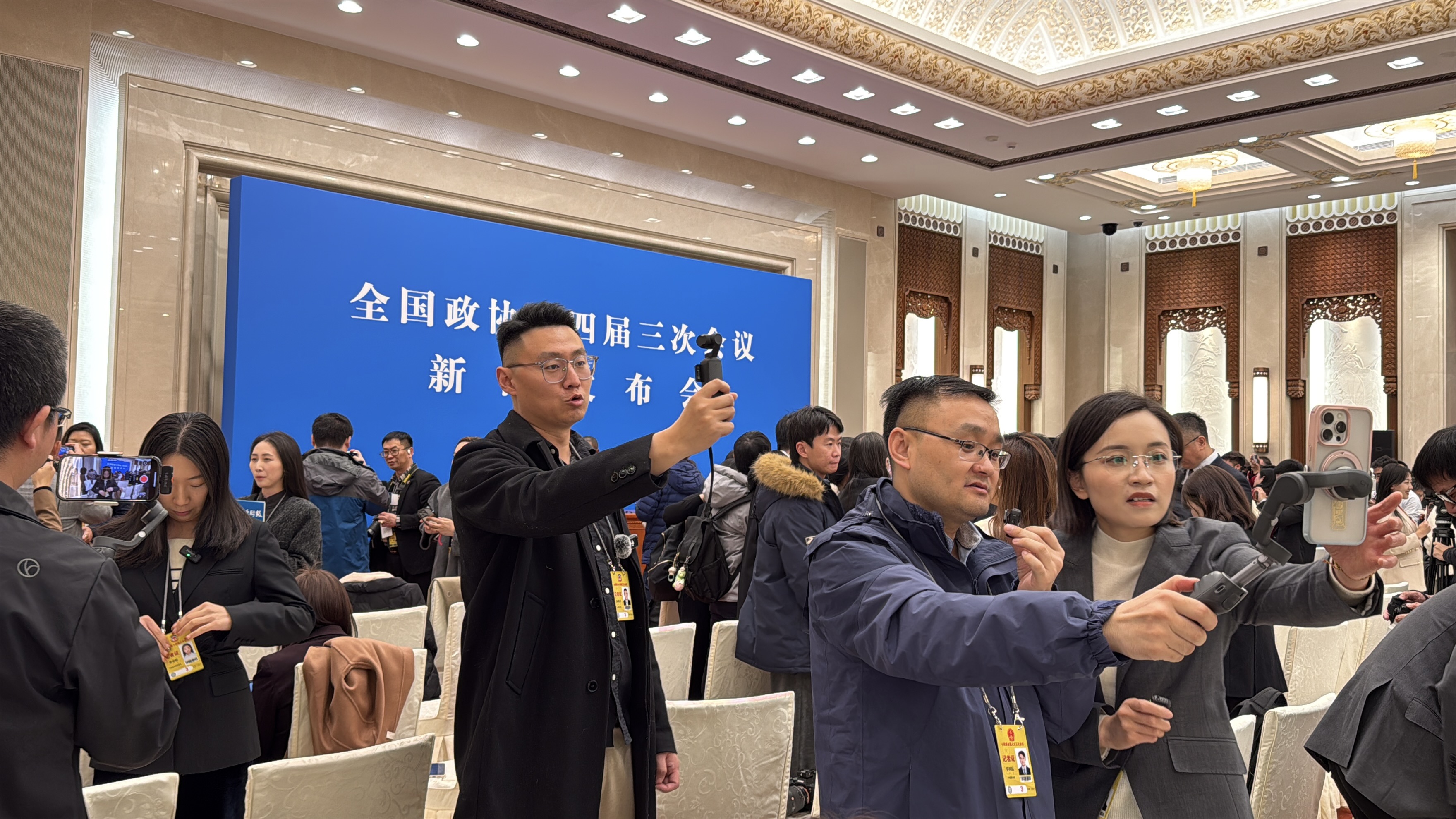 仔細觀察這場記者會,有三個新感覺。最直觀的,是多了很多單兵作戰的視頻出鏡記者。人人都像是「三頭六臂」的哪吒,相機、手機、便攜攝像設備、腳架、燈架甚至提詞器,設備一架,立刻化身出鏡主播。猶記得2023年的全國兩會,因世紀疫情剛過去,能入場的記者有限,於是很多記者不得不「一個人化身一支隊伍」。而今,全面開放報道的兩會,不再限制入場記者人數,但不少記者們主動擁抱了單兵作戰。這一變化,一方面因為科技的進步,輕巧便攜的拍攝設備讓工作化繁為簡,一個人就能搞定之前需要兩三個人協助完成的任務;另一方面則是因為觀眾和讀者對時效性的要求越來越高,因此短平快、小而美的視頻內容,更受普羅大眾青睞。