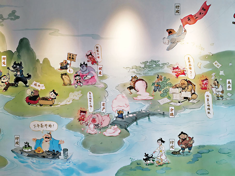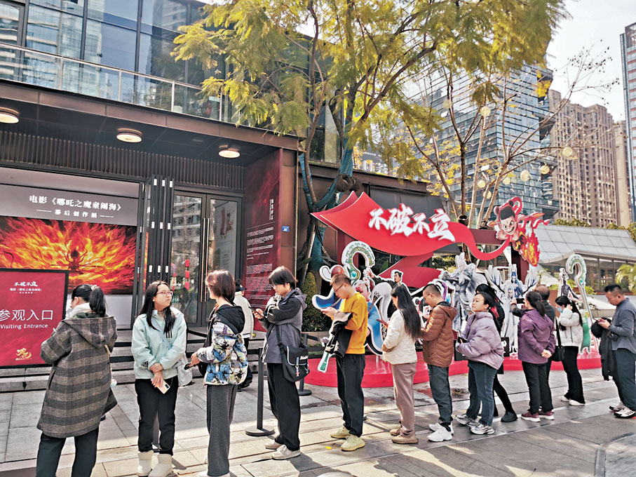 哪吒腳踏風火輪、揮舞紫焰蛇矛火尖槍騰空而降,太乙真人挺着大肚腩、右手持葫蘆正在開懷暢飲……在《不破不立》巨型裝置前,不少市民、遊客排隊步入展區。「《哪吒2》已看過兩遍,非常過癮,更期待了解其背後的故事。」正在排隊的成都市民楊女士說,在家門口的這次展覽令人期待。