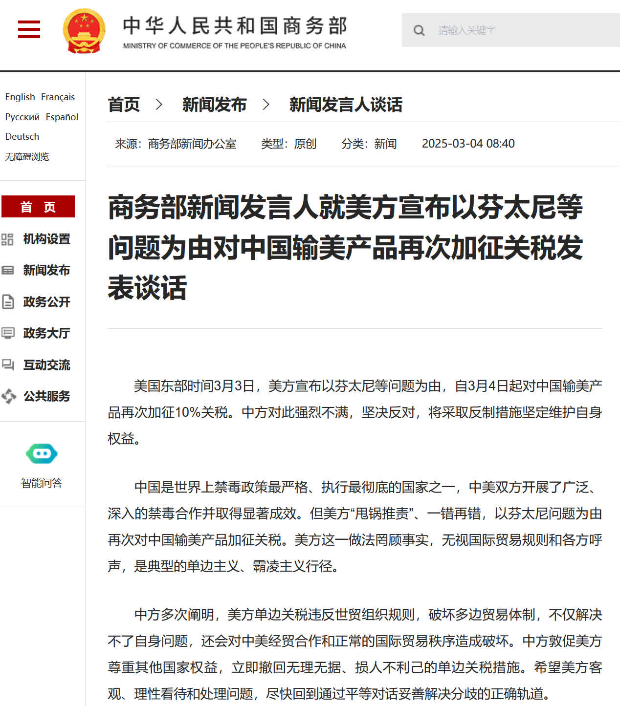 據商務部網站消息,美國東部時間3月3日,美方宣布以芬太尼等問題為由,自3月4日起對中國輸美產品再次加徵10%關稅。中方對此強烈不滿,堅決反對,將採取反制措施堅定維護自身權益。