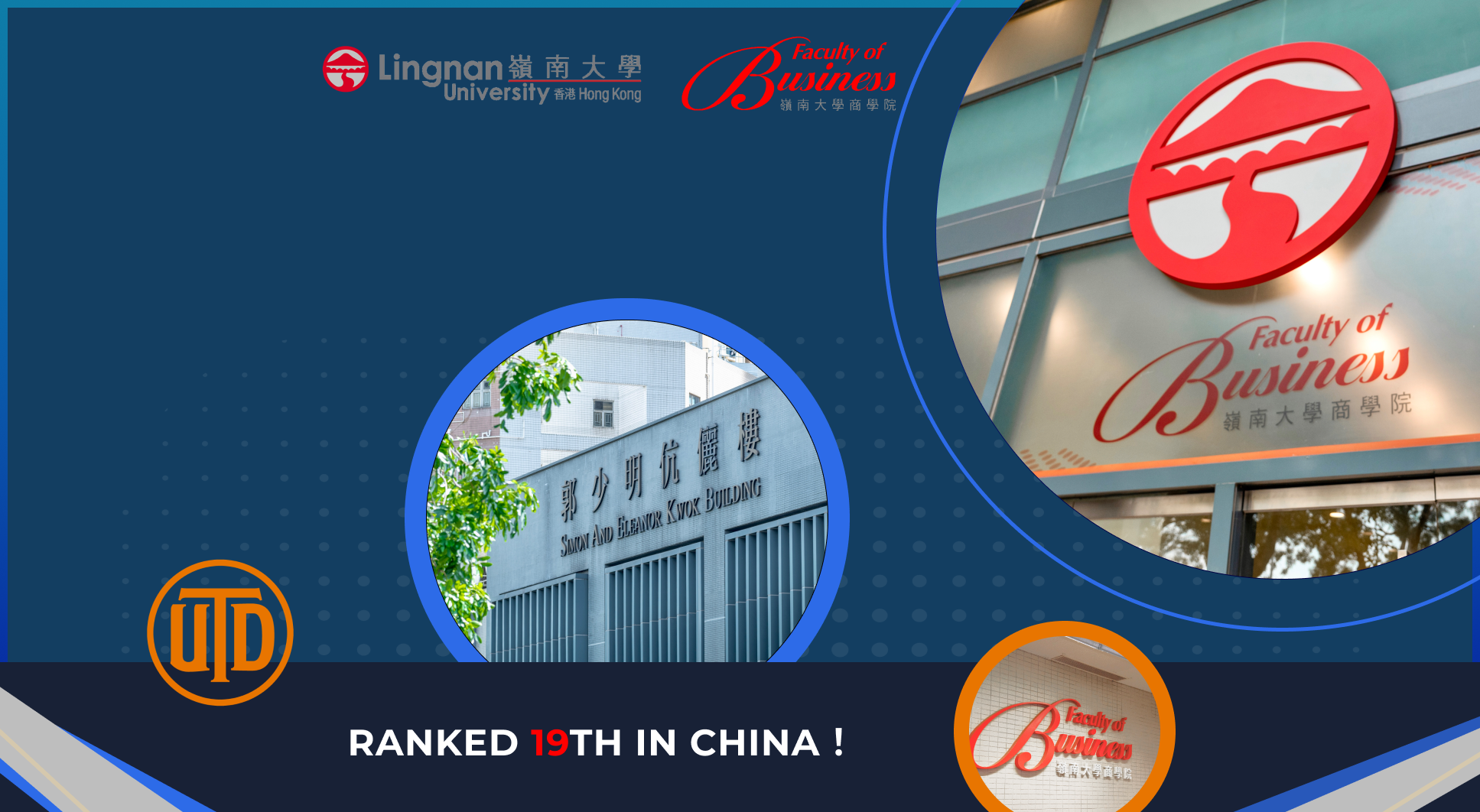在最新公布的UTD「2024年全球商學院科研排名百強(The UTD Top 100 Worldwide Business School Rankings Based on Research Contributions)」榜單中,嶺南大學(嶺大)商學院憑藉其卓越的科研實力和國際影響力,成功入選並位列中國商學院科研排名百強榜第19位,較上年大幅躍升23位,進步顯著。嶺大商學院躋身UTD中國商學院20強,不僅彰顯了其在商學領域的卓越成就,也進一步鞏固了在國際學術界的重要地位。