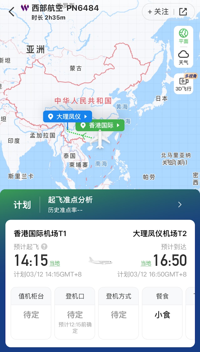 香港至大理航班號為PN6484,起飛時間為14:15,到達時間為16:50,航程約2小時35分鐘,計劃每周三、五、日執飛,執飛機型為空巴A320-200。