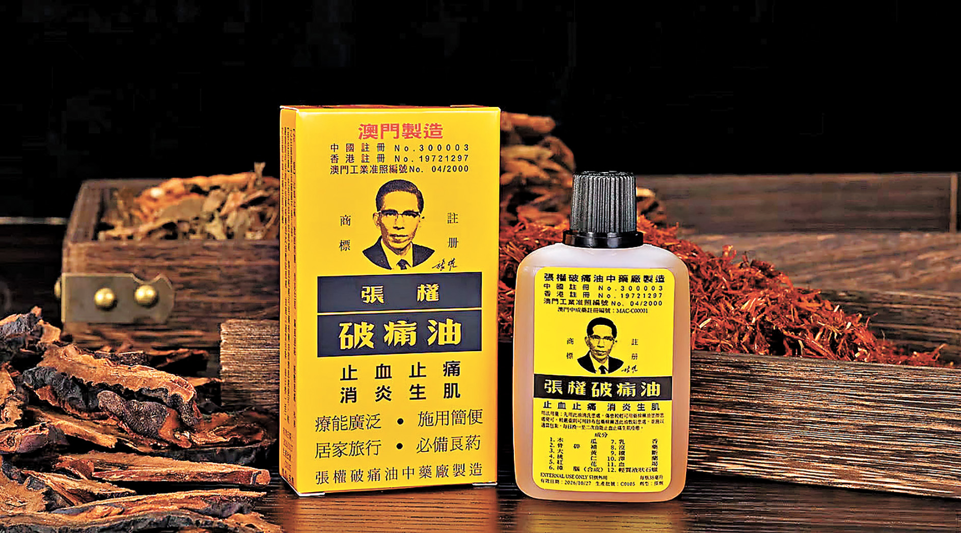 張權破痛油,扎根澳門70年,家傳戶曉、居家旅行之必備良藥,港澳熱賣手信之一。所有成品均統一於澳門自設廠房生產,成分、質量一致,僅外包裝內容根據各地法規有所調整。破痛油暫時有內地、香港、澳門、葡語和新加坡版。右圖則為港版的包裝封面。