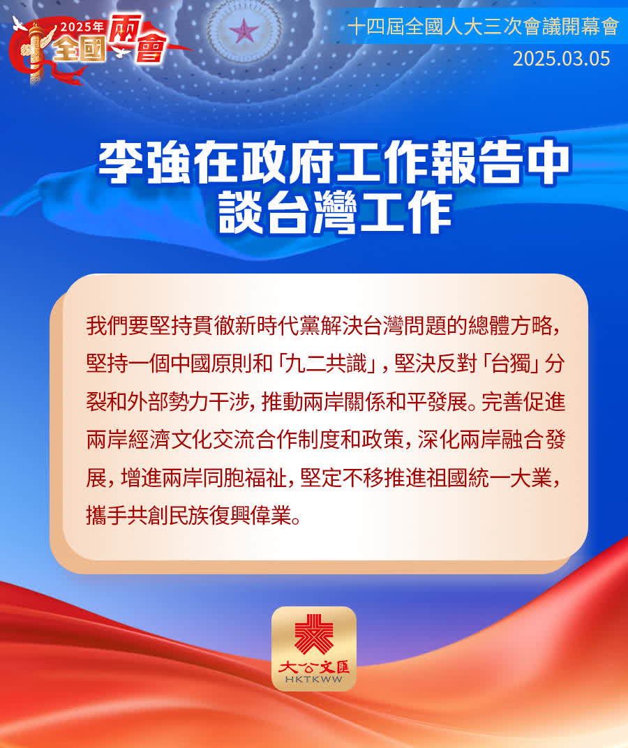 據新華社報道,國務院總理李強5日在政府工作報告中表示,我們要堅持貫徹新時代黨解決台灣問題的總體方略,堅持一個中國原則和「九二共識」,堅決反對「台獨」分裂和外部勢力干涉,推動兩岸關係和平發展。完善促進兩岸經濟文化交流合作制度和政策,深化兩岸融合發展,增進兩岸同胞福祉,堅定不移推進祖國統一大業,攜手共創民族復興偉業。