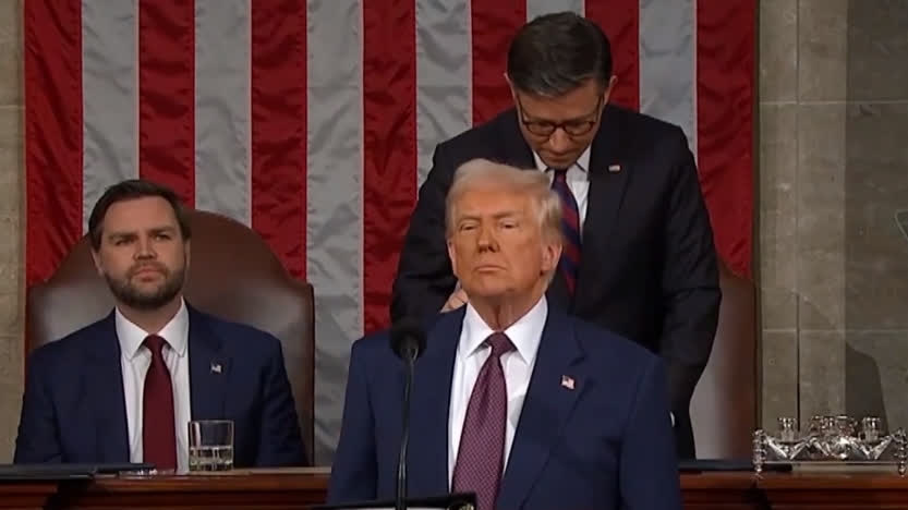 在特朗普以「美國回來了」作為講話開場,並聲稱他們「在43天內取得的成就比大多數政府在四年或八年內取得的成就還要多,而且我們才剛剛開始。」後,民主黨人發出了噓聲和嘲笑,共和黨人則高呼「美國」進行反擊。議長約翰遜起身敲響議事槌,試圖恢復秩序和「禮儀」。與此同時,他讓警衛帶走了得克薩斯州民主黨眾議員艾爾·格林。