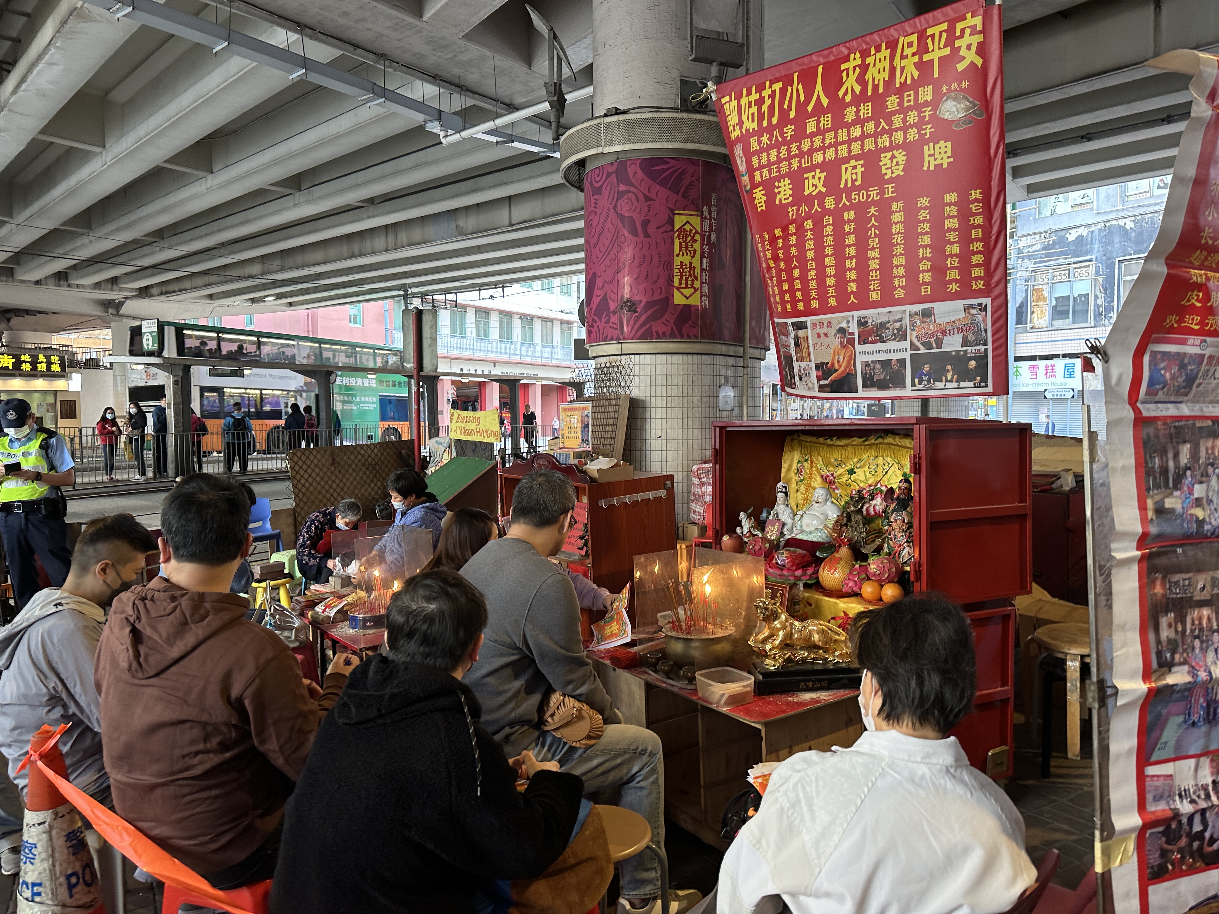 今日午時,銅鑼灣鵝頸橋底有數十個檔攤,橋底擠滿大批善信,有十逾名警察在場疏導人流。有善信早在早上8時就趕到現場,未料遭「打尖」,排隊多個小時仍未排到。亦有遊客專程從深圳來港「打小人」,祈求好彩頭。