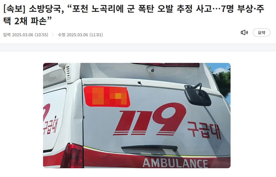 大公文匯網報道,當地時間今天(3月6日)上午,據多家韓國媒體報道,當天上午10時左右韓國京畿道抱川市居民報警稱「炮彈墜入民宅」。截至記者發稿,據報道事故已造成7人受傷,其中4人重傷,2處民宅受損。