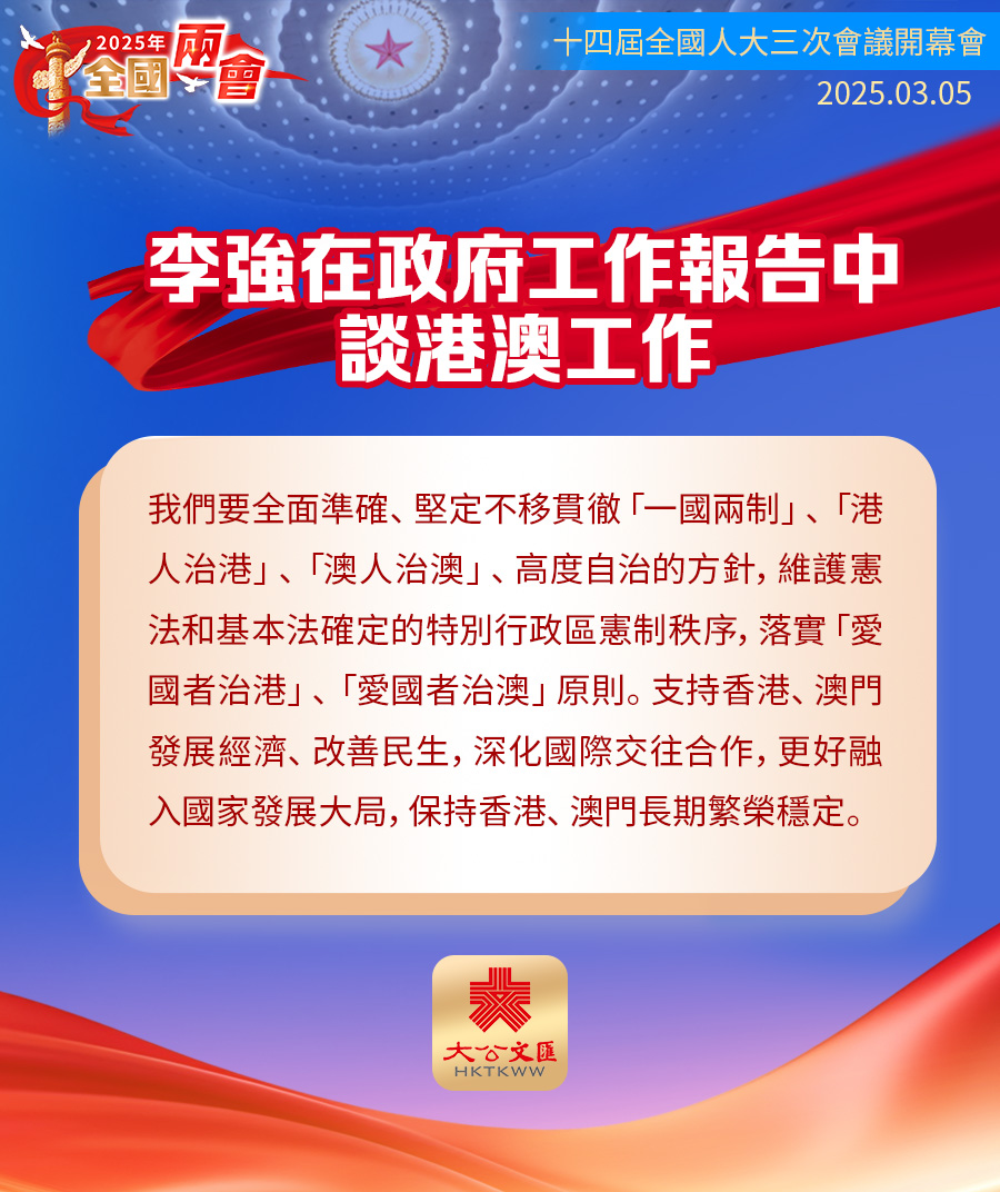 大公文匯網報道,三月的北京,春意盎然,全國兩會正在隆重召開。國務院總理李強3月5日在政府工作報告中表示,我們要全面準確、堅定不移貫徹「一國兩制」、「港人治港」、「澳人治澳」、高度自治的方針,維護憲法和基本法確定的特別行政區憲制秩序,落實「愛國者治港」、「愛國者治澳」原則。支持香港、澳門發展經濟、改善民生,深化國際交往合作,更好融入國家發展大局,保持香港、澳門長期繁榮穩定。港區全國人大代表、政協委員聽後為之振奮,紛紛表示將繼續履職盡責,為推進中國式現代化、香港的由治及興貢獻自己的力量。