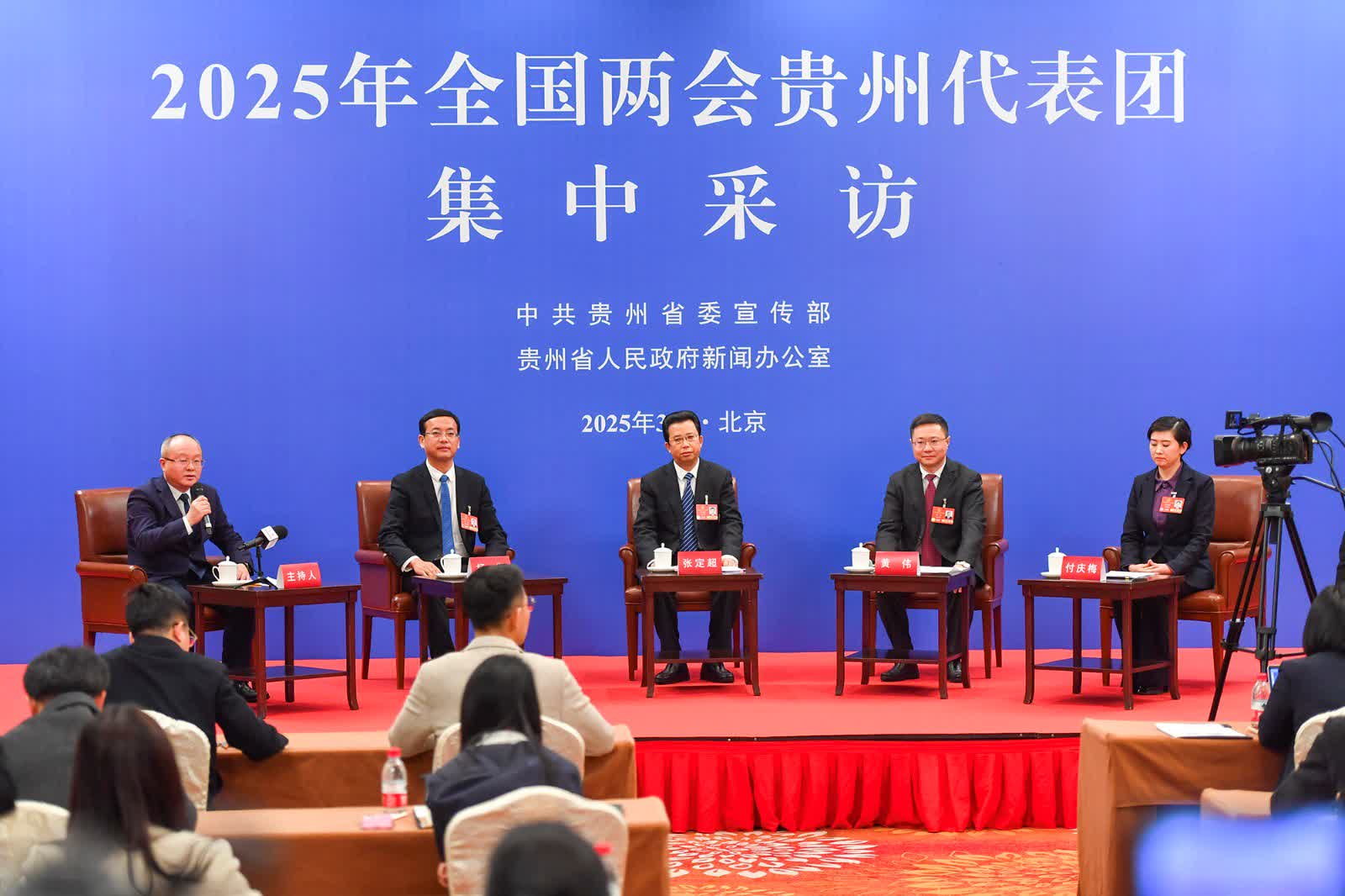 圍繞貴州強力推進大抓產業、大抓項目、大抓招商經濟工作「頭號工程」,5日晚,與會的貴州代表團便組織開啟了首場集中採訪,邀請了六盤水市委書記張定超,遵義市委副書記、市長黃偉,三都水族自治縣委副書記、縣長楊凱,赫章縣副縣長付慶梅等4名全國人大代表答記者問。