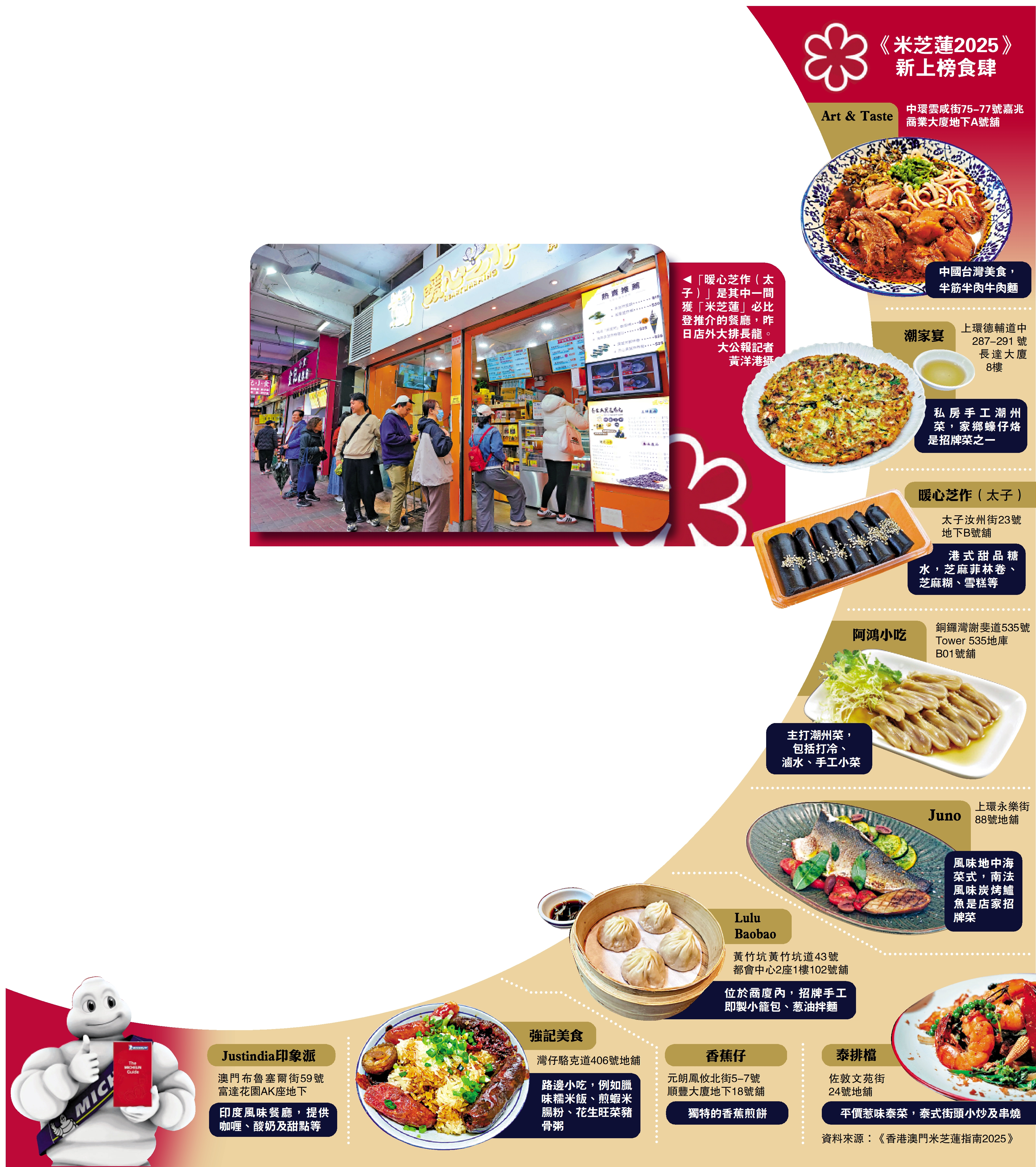 (大公報 記者 賴振雄)美食指南「米芝蓮」昨日公布2025年必比登推介港澳名單,香港共有66間食肆入選,九間平民食店餐廳新上榜,包括位於佐敦文苑街的「泰排檔」泰國菜、街頭甜品小吃店的「暖心芝作(太子)」,憑獨特的香蕉煎餅打出名堂的「香蕉仔」。