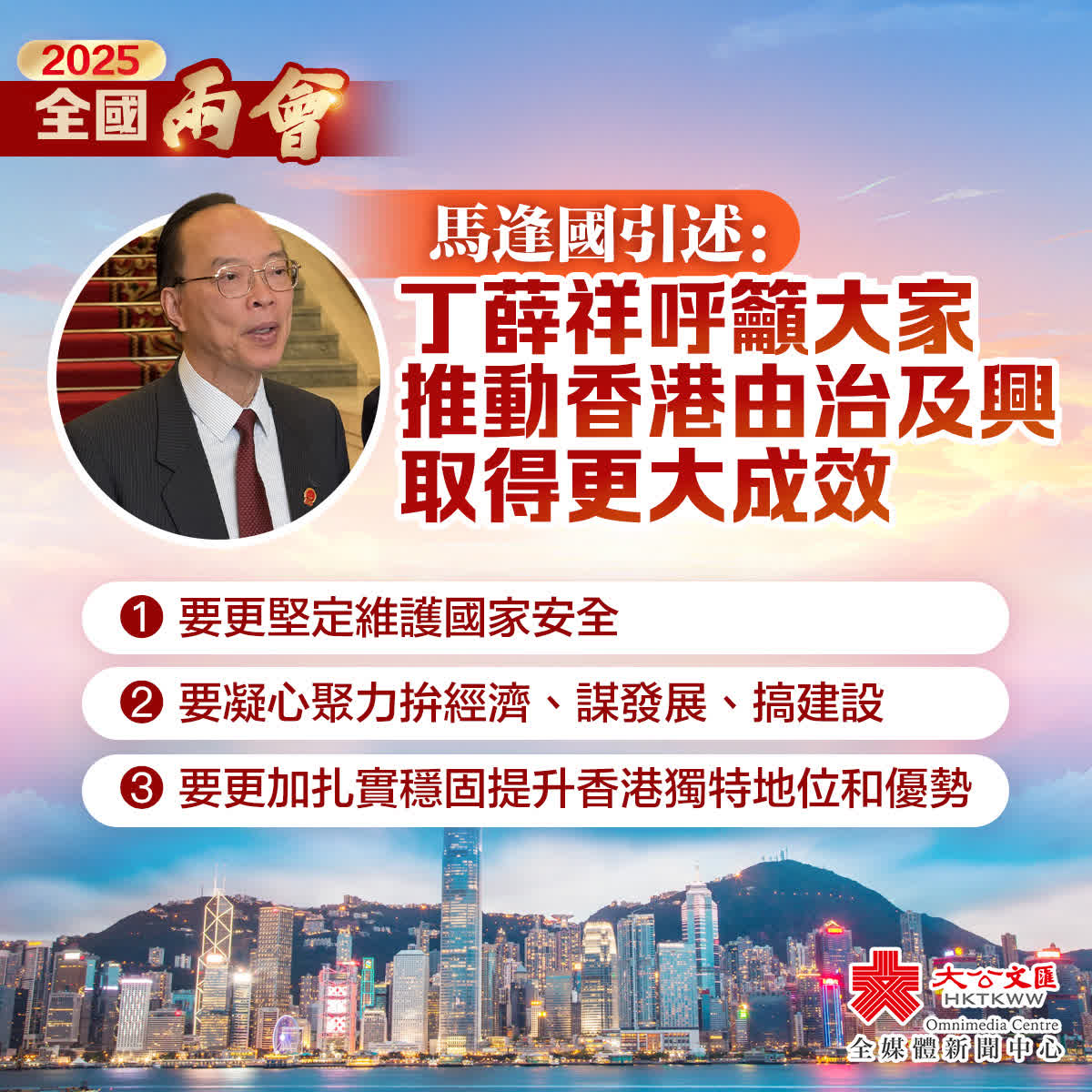 丁薛祥呼籲大家深入學習貫徹習主席講話精神,推動香港由治及興取得更大成效。首先要更堅定維護國家安全,其次要凝心聚力拚經濟、謀發展、搞建設,第三要更加扎實穩固提升香港獨特的地位和優勢。