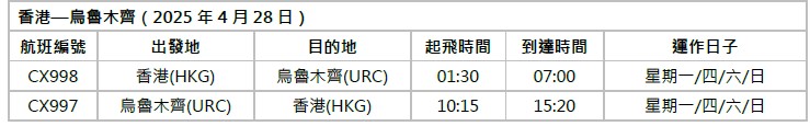 國泰航空往來香港與烏魯木齊的新航線,會以空中巴士A330-300航機營運,設有商務客艙和經濟客艙。航班時間如下(皆為當地時間,需經相關機構核准):
