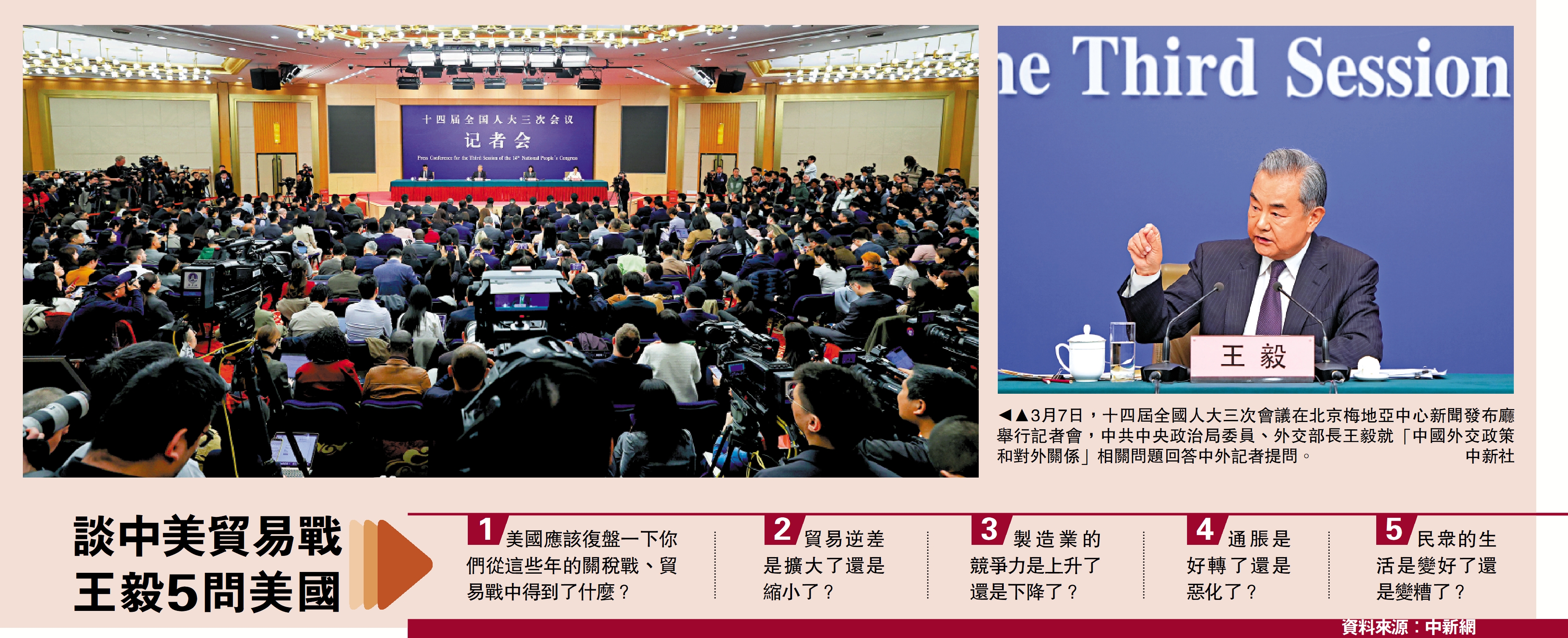 (大公報記者 馬靜)十四屆全國人大三次會議7日舉行記者會,中共中央政治局委員、外交部長王毅就「中國外交政策和對外關係」回答記者提問。
