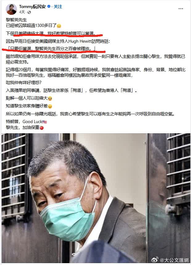 還記得特朗普2024在競選期間接受訪問時,曾表示若當選,會要求釋放黎智英。