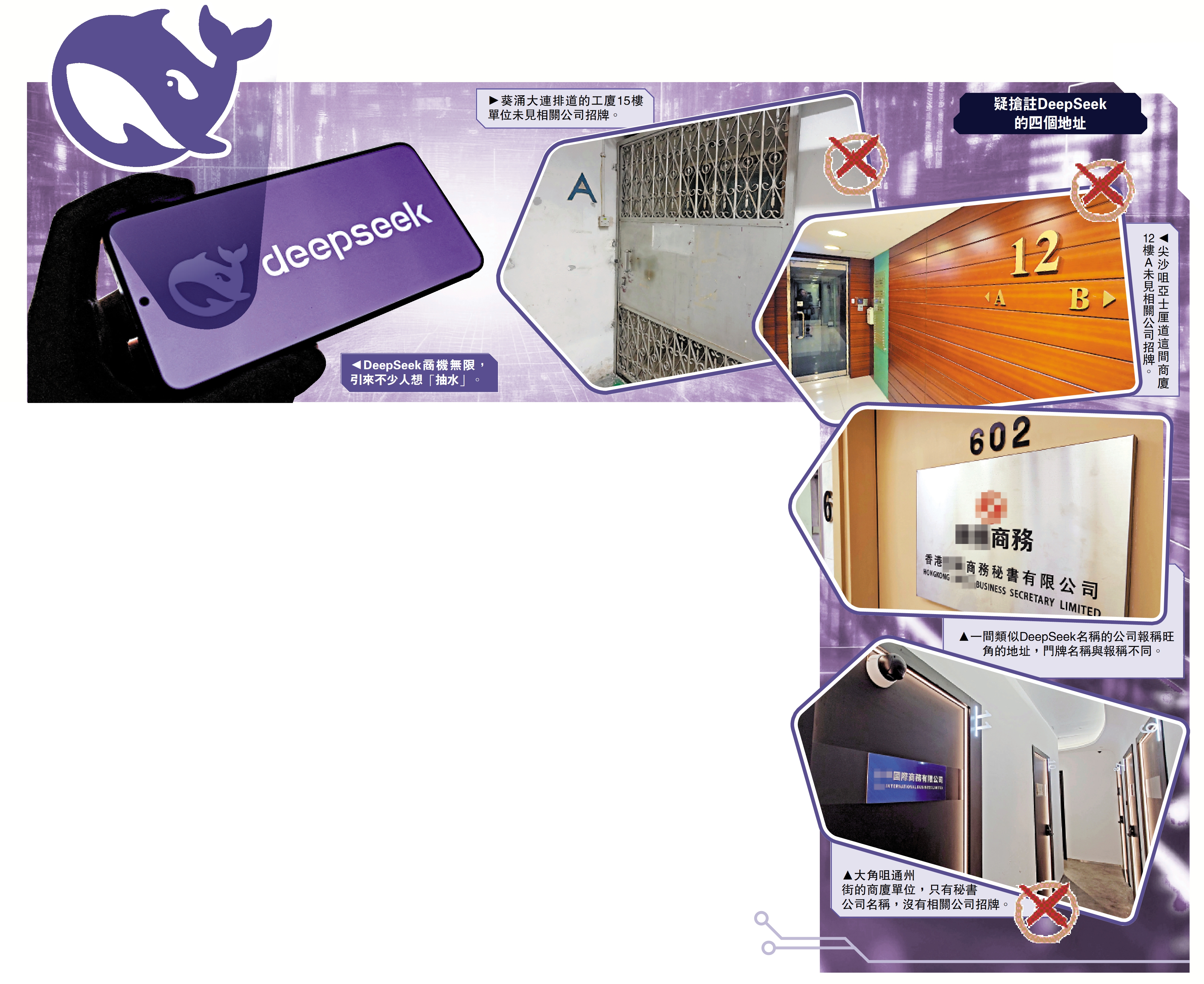 大公報記者昨日分別前往位於葵涌、尖沙咀、旺角、大角咀的相關地址,發現單位門牌都沒有相關公司的名稱,有的顯示是商務秘書公司。