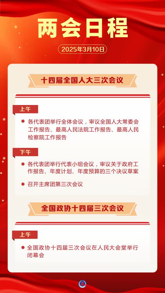 十四屆全國人大三次會議各代表團10日上午舉行全體會議,審議全國人大常委會工作報告、最高人民法院工作報告、最高人民檢察院工作報告。下午,各代表團舉行代表小組會議,審議關於政府工作報告、年度計劃、年度預算的三個決議草案;召開主席團第三次會議。
