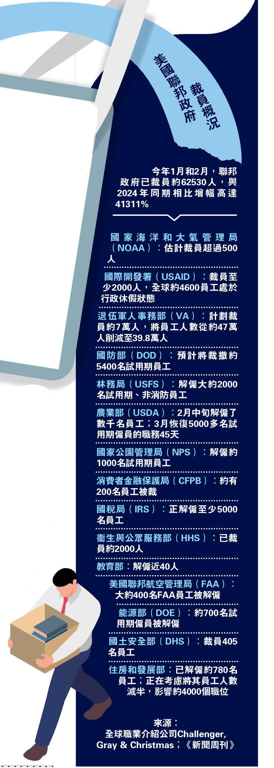 美國聯邦政府是美國就業市場的最大僱主,但自特朗普1月20日重返白宮以來,富豪馬斯克領導的「政府效率部」(DOGE)對聯邦政府發動前所未有的裁員行動。數據顯示,整個2月期間,美國聯邦政府減少了1萬個就業機會,這意味着大批聯邦職員和外包人員將重新投入勞動力市場。現階段美國勞動力市場需求低,被裁職員將很難得到工作機會。此外,這些人中不少曾在競選時支持特朗普,DOGE裁員恐對特朗普票倉造成衝擊。