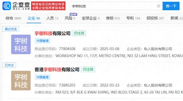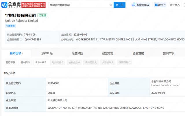 大公文匯全媒體報道,企查查APP顯示,近日,宇樹科技有限公司(英文名 Unitree Robotics Limited)成立,企業類型為私人股份有限公司。據悉,宇樹科技曾於2022年成立香港宇樹科技有限公司(英文名 HONG KONG YUSHU TECHNOLOGY LIMITED),不久前,其又在深圳成立全資子公司深圳天羿科技有限公司。