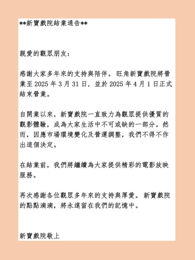 大公文匯全媒體報道,旺角新寶戲院今日(10日)宣布,將於4月1日正式結業。戲院將營業至3月31日,在此之前會繼續為大家提供精彩的電影放映服務。