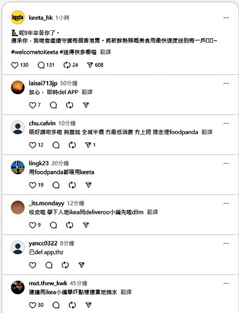 Deliveroo曾是香港外賣平台的「一哥」,但之後備受foodpanda等平台爭奪市場。前年5月,內地美團旗下Keeta進軍香港,市場競爭更激烈。去年有機構調查顯示,Keeta截至去年3月,訂單數量已佔香港外賣市場約44%份額,躍居全港首位。而foodpanda的市場份額則由此前的60%降至41.6%,Deliveroo最少,份額僅不足25%。
