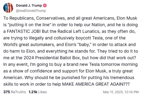 大公文匯網報道,當地時間3月10日,美國總統特朗普在社交媒體發文表達對馬斯克的支持。他寫道:對共和黨人、保守派和所有美國人來說,馬斯克正全力以赴幫助我們的國家而且做得非常出色,但「激進的左翼瘋子們」卻試圖非法串通抵制特斯拉,以攻擊和傷害馬斯克以及他所代表的一切。「不管怎樣,我明早都要買一輛全新的特斯拉,以示對馬斯克的信任和支持——他是個真正偉大的美國人。」