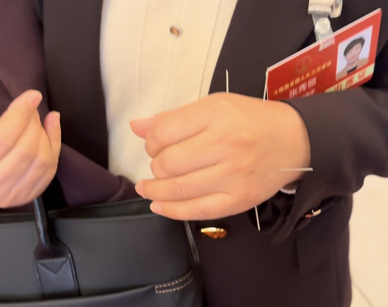 採訪過程中,記者留意到一個細節:張秀麗的手背上密密麻麻扎着針灸針。詢問得知,原來是她腿疼不已,幸得一位懂中醫的代表幫忙,在手背上精準取穴扎針緩解疼痛。這讓記者深切感受到兩會代表身上「溫暖」、「溫情」的一面。張秀麗並未透露這是哪位中醫代表,但經記者查詢,發現原來是來自河南的全國人大代表、河南汝州金庚康復醫院院長宋兆普。他隨身攜帶30根銀針,會議間隙、代表團駐地、散步街上……只要有人需要,他便就地施治,被大家親切地稱為行走的「兩會診所」。今年兩會期間,他平均每天為約20人緩解病痛,從腰腿疼痛到突發心悸,銀針所至,病痛立緩。